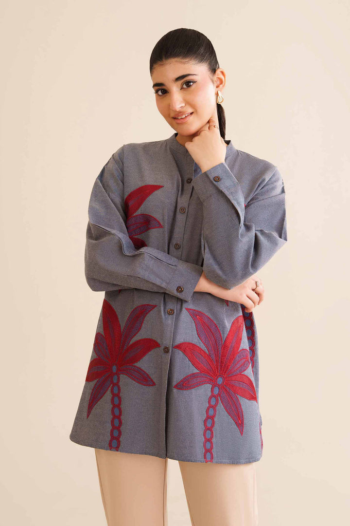 Button-down tunic with embroidered front panels, a band neckline, and a rounded hem.
