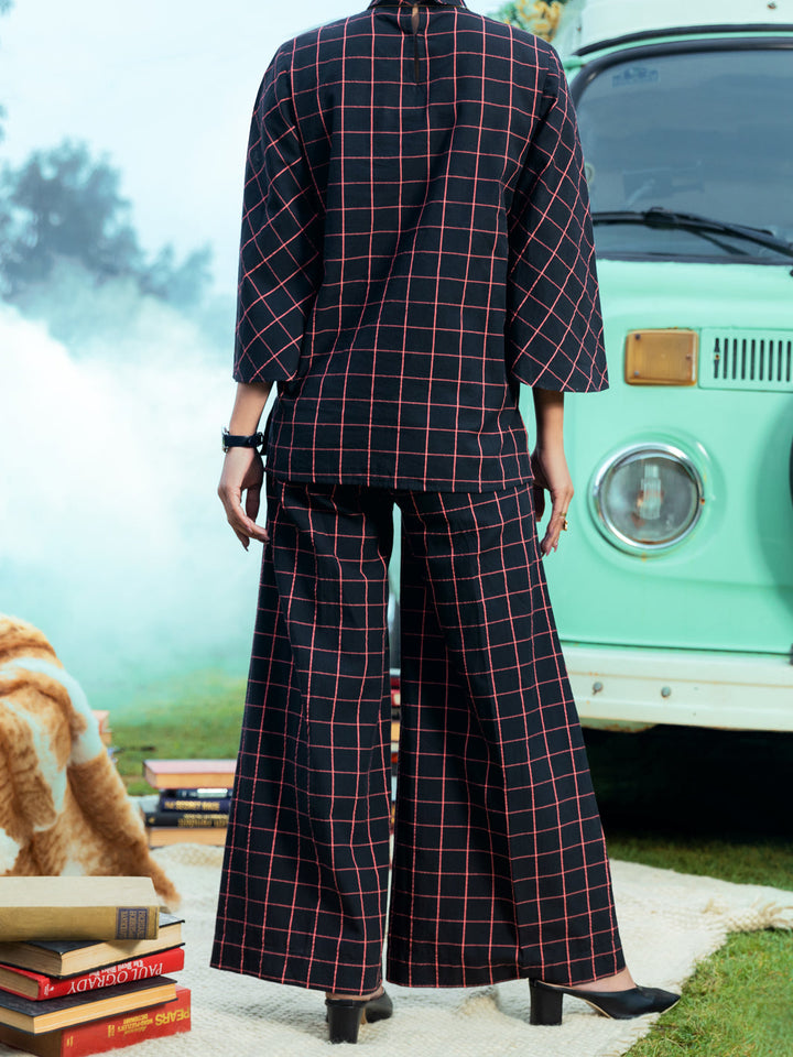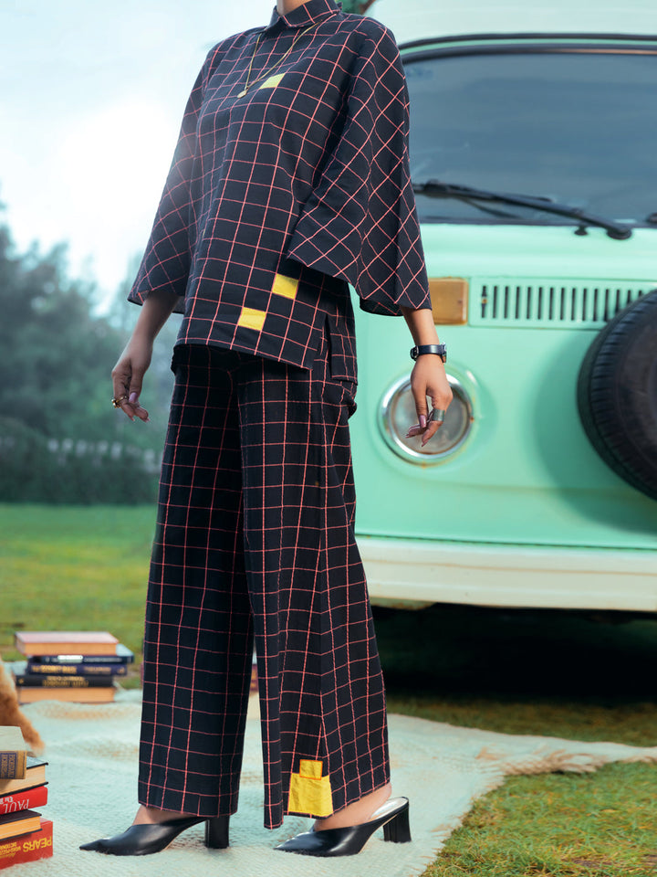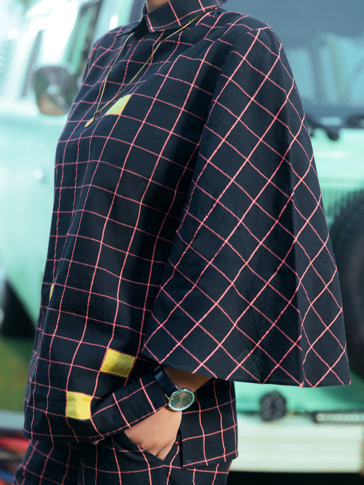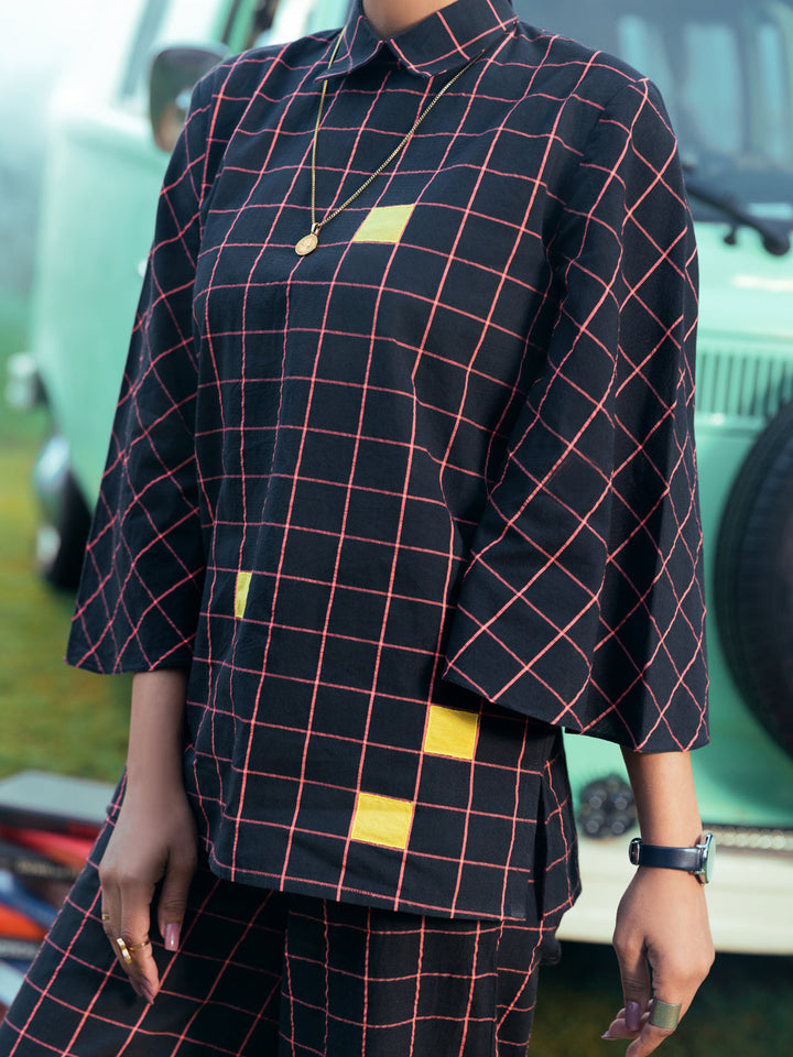 A Checkered Yarn-Dyed Short Length Shirt Detailed With Shirt Collar And Exaggerated Bell Sleeves, Adding Contrasting Yellow Patches Randomly.
