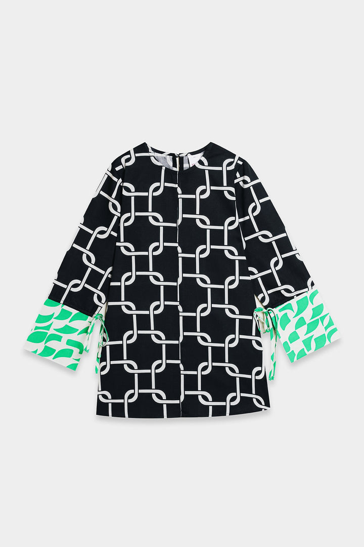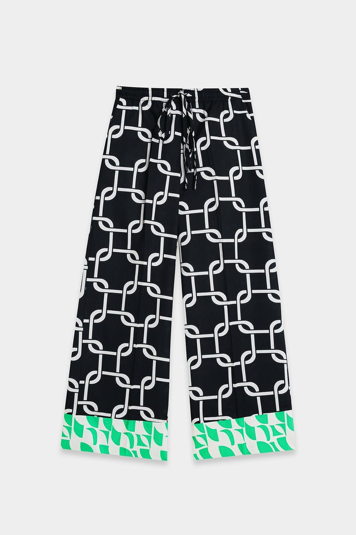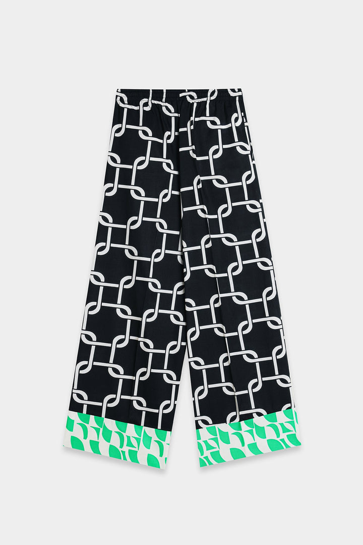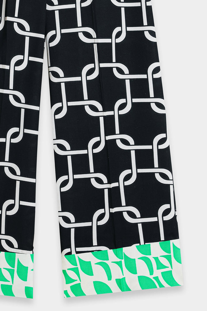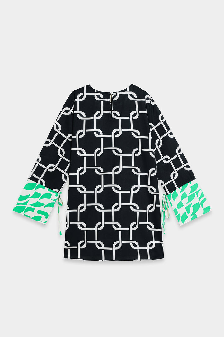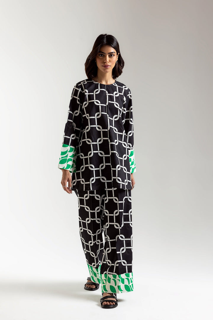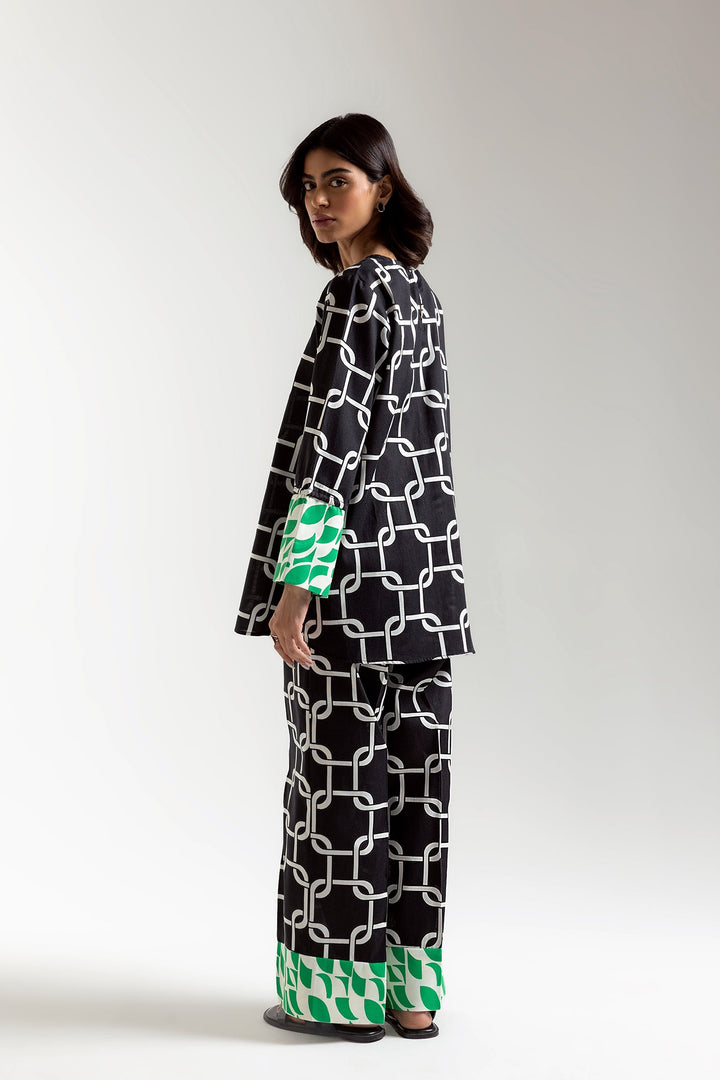 Make a bold statement with this classy outfit. The striking geometric design in white and sea green contrasts beautifully against the deep black hue. The sophisticated top features flared sleeves, while the complementing straight pants complete the refined ensemble. Perfect for any social gathering or a casual event, this modern outfit will make you stand out.