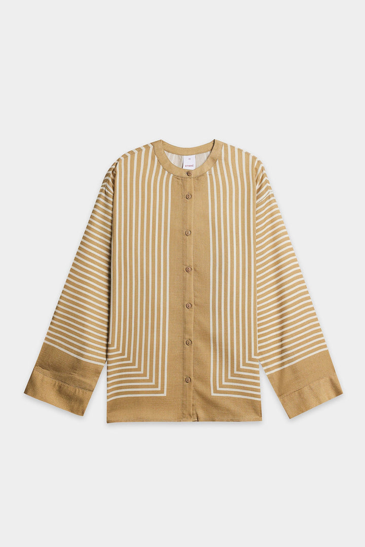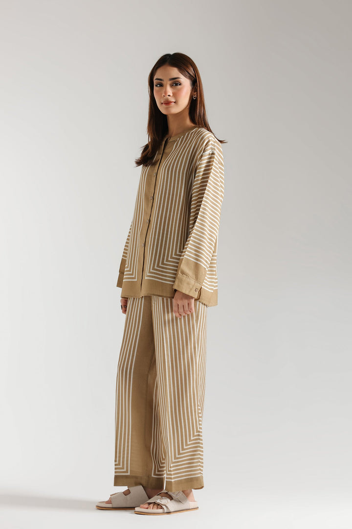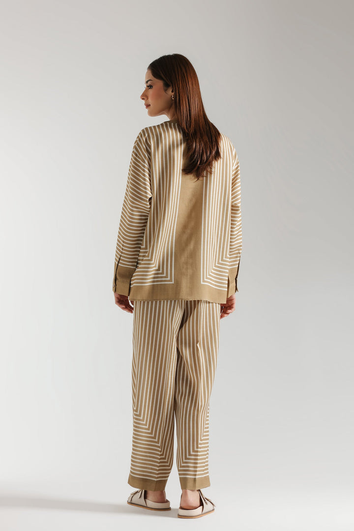Introducing the stunning grey shade outfit. This contemporary ensemble boasts a mesmerizing striped design in a vibrant olive green hue illustrating geometric square shapes. Crafted with a trendy button down top and matching straight pants, this outfit exudes elegance. Perfect for fun gatherings, make a statement with this monochromatic must-have.