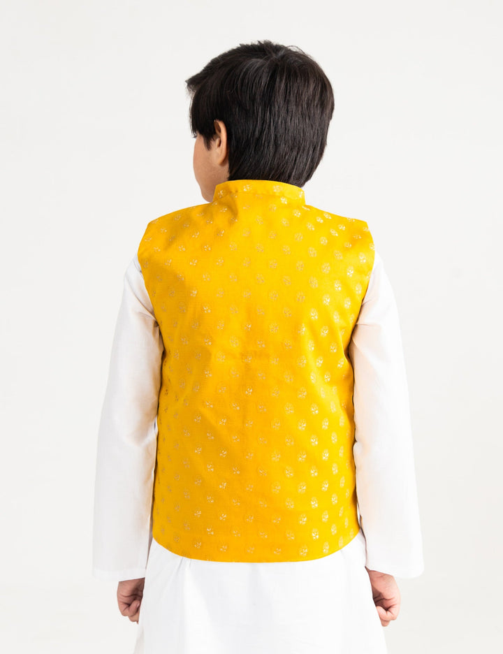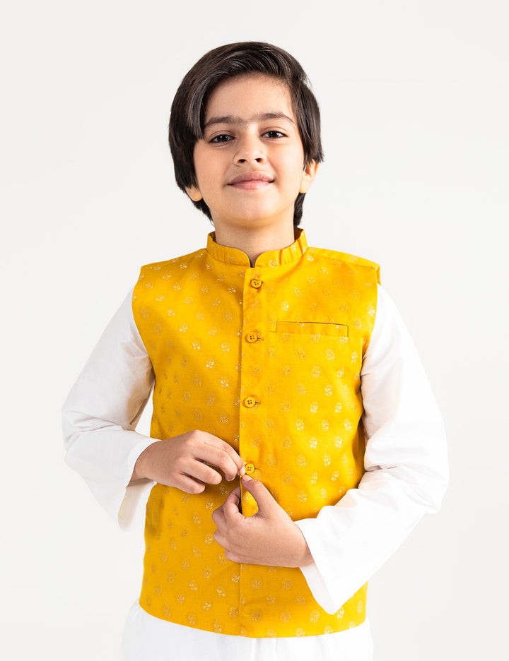 Classic waistcoat is designed in gorgeous jacquard motif. Coordinate this waistcoat with available white kurta trouser. Must have this for upcomig festive season.