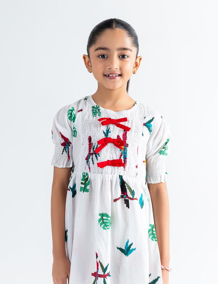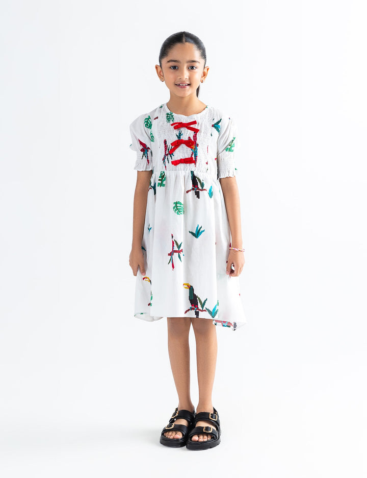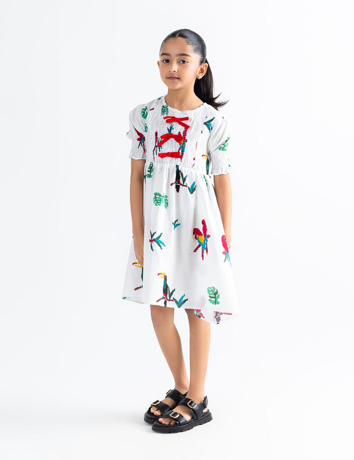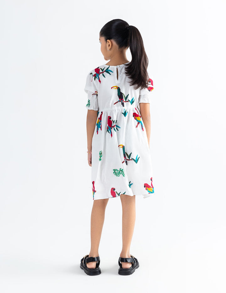 Let your girl step into a world of color and fun with this vibrant Tropical Parrot Print Dress. Featuring a playful all-over parrot and tropical leaf pattern, this dress is made for sunny days and carefree adventures. The lightweight, breathable fabric and relaxed fit ensure comfort all day long — perfect for vacations, parties, or casual outings.