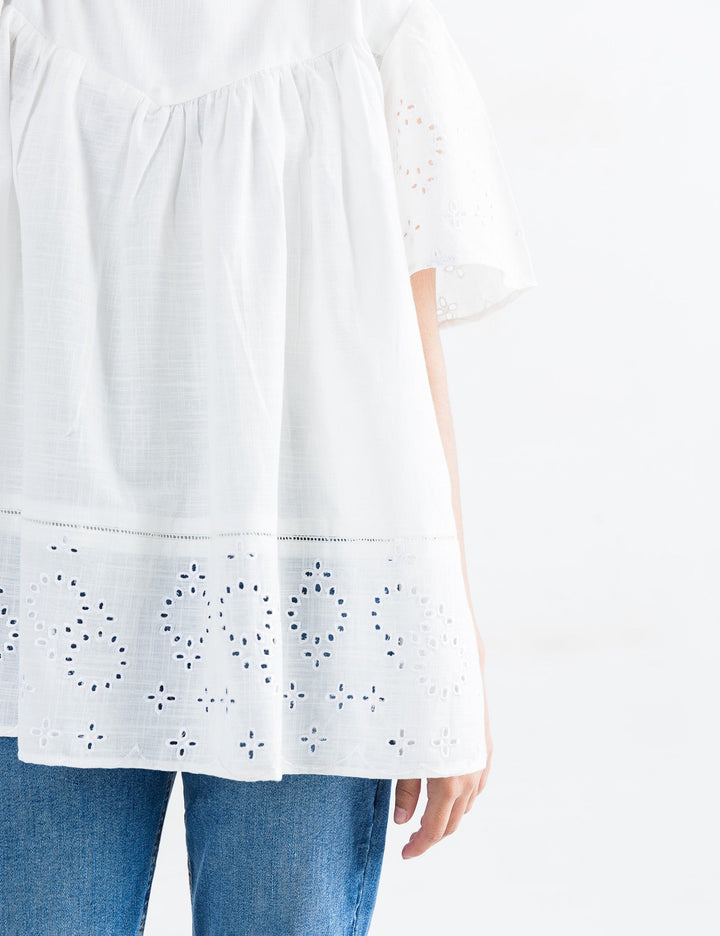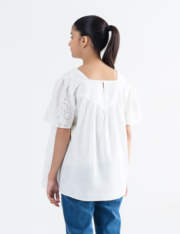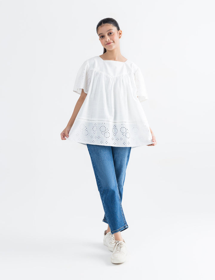 Delicate and timeless, this white floral embroidered top is a lovely choice for girls. Crafted from lightweight, breathable fabric, it features intricate eyelet-style floral embroidery on the flutter sleeves and hem for a charming, airy look. The square neckline and gathered bodice add a touch of elegance while ensuring a relaxed and comfortable fit. Perfect for warm days, pair it with jeans, leggings, or skirts for a sweet, summery outfit!