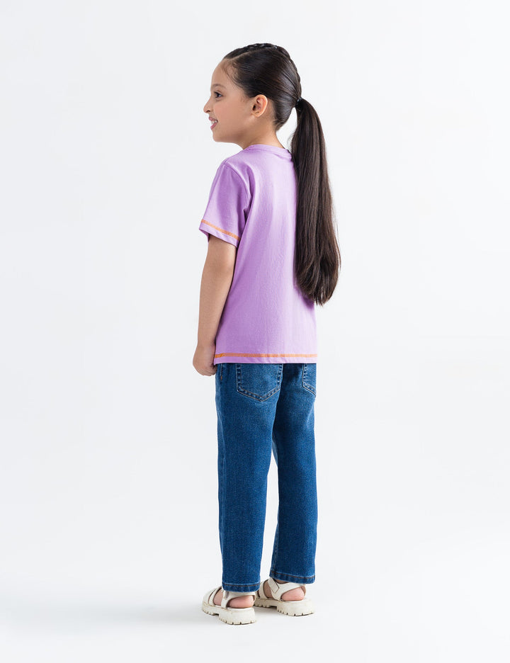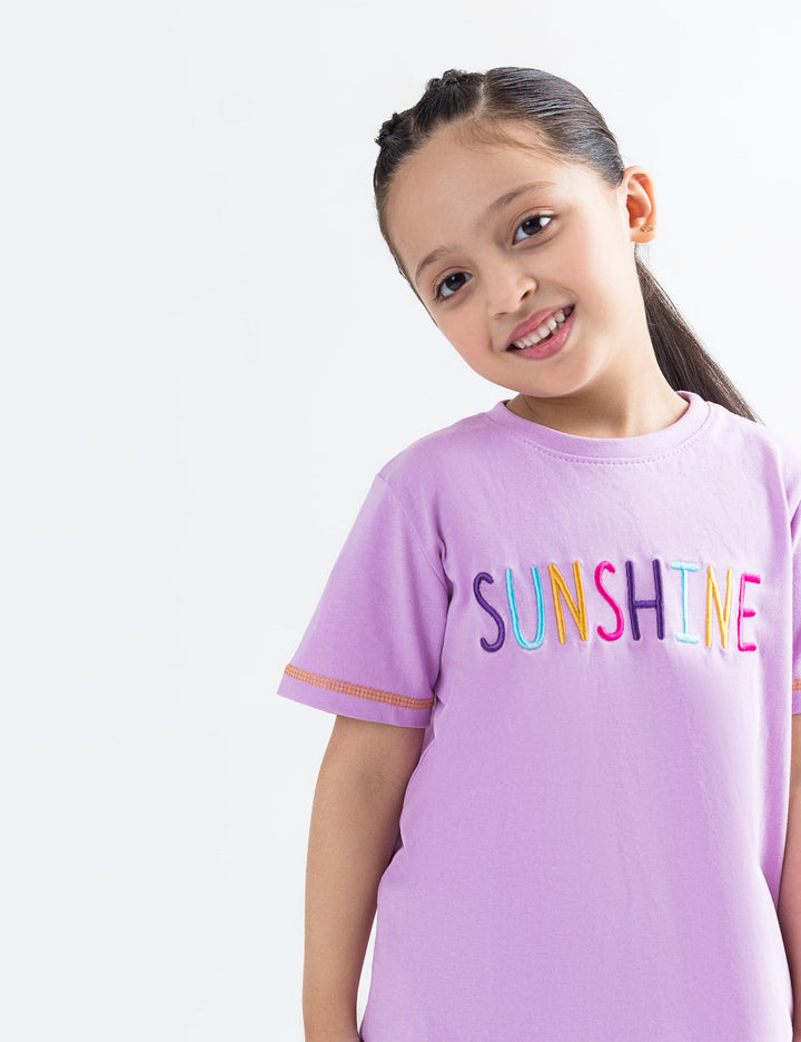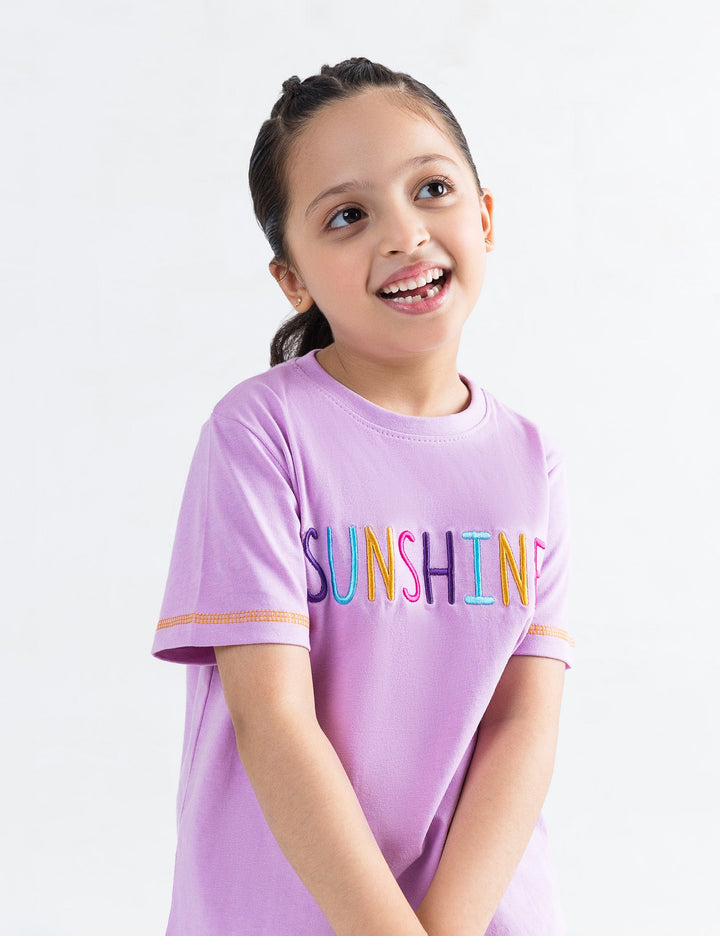 Add a pop of positivity to her day with this cheerful Sunshine Embroidered T-Shirt! Designed in a soft lavender hue, it features the word "SUNSHINE" beautifully embroidered in bright, multicolored thread across the chest. Made from soft, breathable cotton, it ensures all-day comfort, while the contrast stitching on the sleeves and hem adds a playful touch. Perfect for pairing with jeans, shorts, or skirts for a fun, casual look.