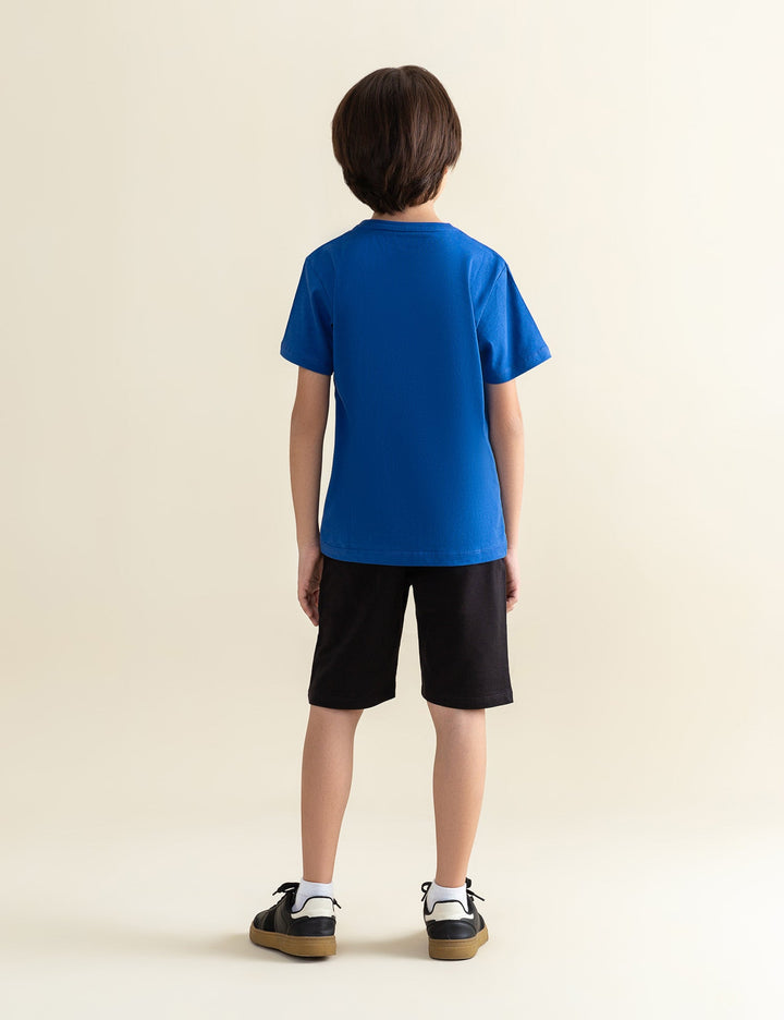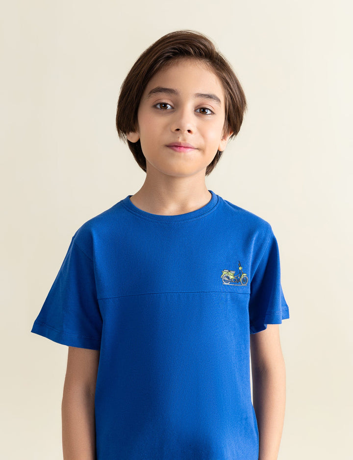 Add a touch of cool to his casual look with this vibrant blue T-shirt for little boys. Featuring a small embroidered motorbike graphic on the chest and a “Two Wheel” label near the hem, it blends minimal style with playful details. Made from soft, breathable cotton, it offers all-day comfort, while the classic crew neck and short sleeves make it perfect for pairing with jeans, shorts, or joggers for everyday adventures.
