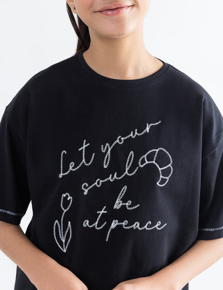 Inspire calm and confidence with this beautifully designed "Let Your Soul Be at Peace" embroidered t-shirt for girls. Featuring a meaningful message delicately embroidered on soft, breathable cotton, this tee blends comfort with positive vibes. The minimal design and gentle colors make it easy to pair with jeans, skirts, or shorts for a laid-back, thoughtful look. Perfect for school, weekend wear, or cozy days at home