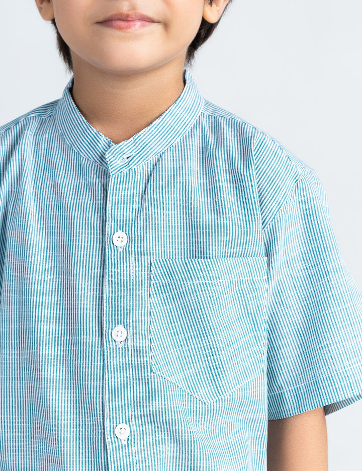 Give his look a smart upgrade with this striped button-down shirt, perfect for both casual outings and special occasions. Featuring a classic vertical stripe pattern, this shirt adds a timeless touch to his wardrobe. Made from soft, breathable fabric, it ensures all-day comfort, while the banned collar neckline and button-front design bring a polished finish. Easy to pair with jeans, chinos, or shorts—ideal for school, events, or family gatherings.