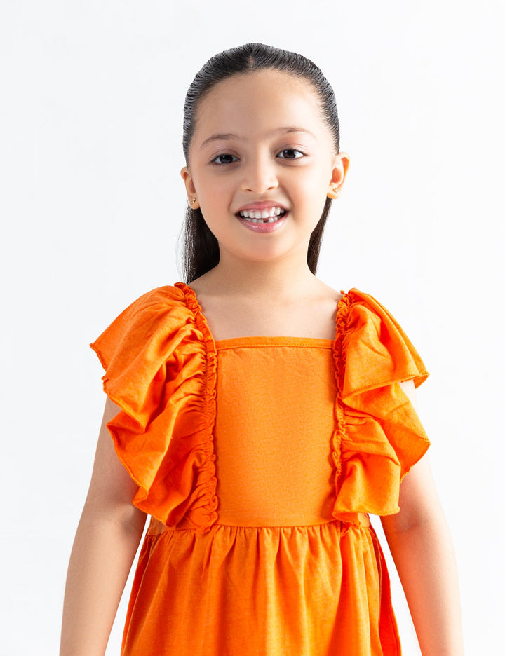 Brighten up your little girl's wardrobe with this charming dress. Made from soft, breathable cotton, it features fluttery ruffle sleeves and a comfortable gathered waistline that allows ease of movement and a cute, playful silhouette. Perfect for warm-weather outings, parties, or everyday fun, this dress combines simplicity with a touch of flair.
