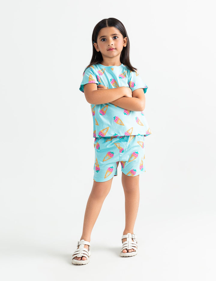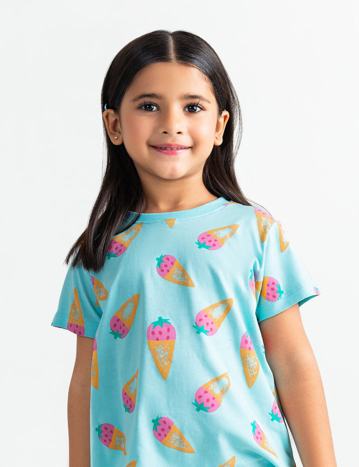 Sweeten her style with this 2 Piece Allover Strawberry Printed Suit for Little Girls. The set includes a cute strawberry-printed top paired with matching bottoms, making it a delightful outfit for everyday wear or fun outings. Crafted from soft, breathable fabric, it ensures all-day comfort while adding a playful and charming touch to her wardrobe.