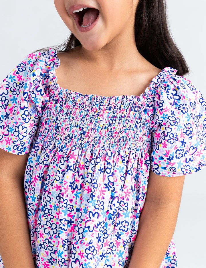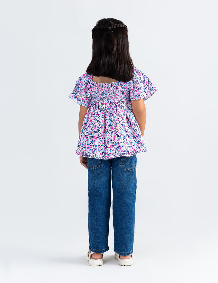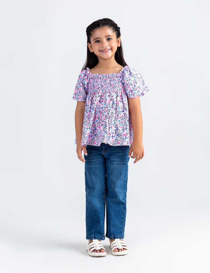 Brighten up her everyday look with this floral printed top, designed with a vibrant all-over floral pattern that adds a cheerful, girly touch. Made from soft, breathable fabric, it ensures all-day comfort—perfect for playdates, school, or family outings. With its relaxed fit and easy-to-style design, it pairs beautifully with jeans, leggings, or skirts for a fresh, fun look. A lovely must-have for every little fashionista!