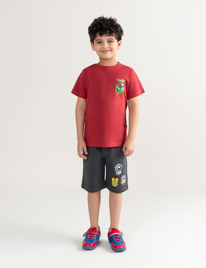 Bring out his superhero spirit with this 2 Piece Avengers Graphic Suit for Boys. The set includes a bold red T-shirt featuring Thor’s graphic and comfortable dark shorts with prints of Captain America, Iron Man, and Thor. Made from soft, breathable fabric, this suit ensures all-day comfort while keeping him stylish for play, casual outings, or superhero-themed fun.