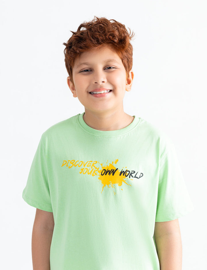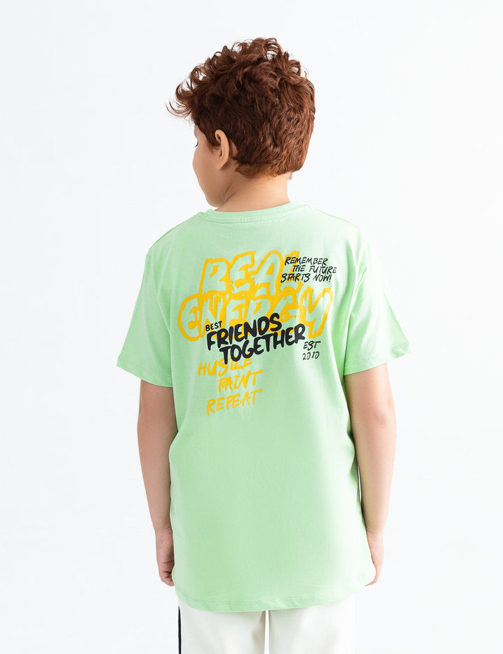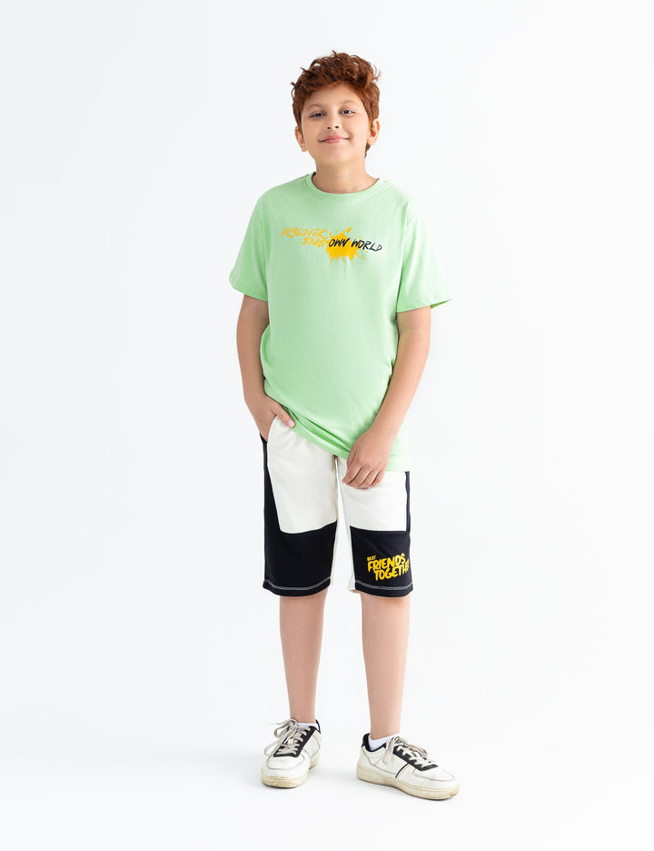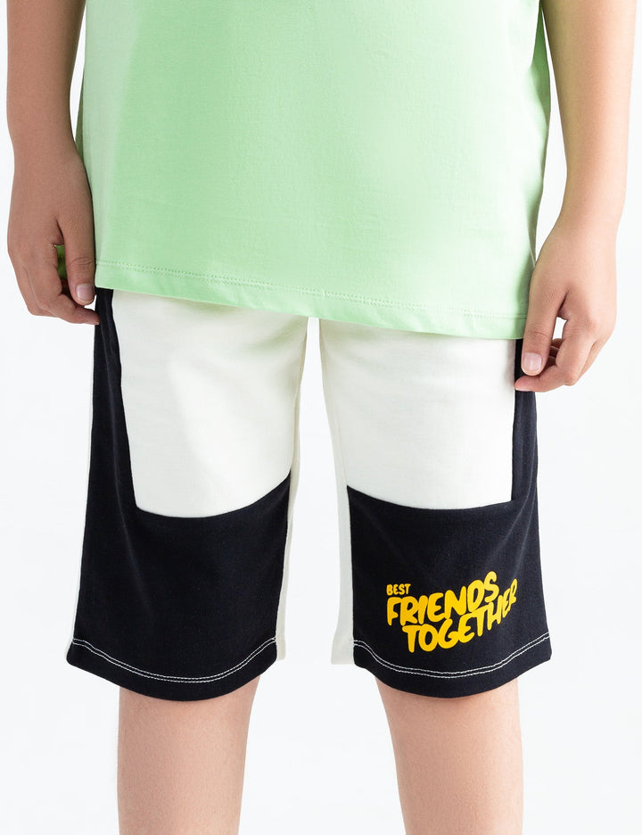Add a playful touch to his wardrobe with this 2 Piece Printed Suit for boys. The light green t-shirt features a fun "Discover Your Own World" graphic for a trendy look, while the comfy cream shorts with bold black side panels and "Best Friends Together" print bring sporty style and comfort. Made from soft, breathable fabric with an elastic waistband and drawstring, this outfit is perfect for casual outings, playtime, or everyday wear. A cool and practical set every boy will love!