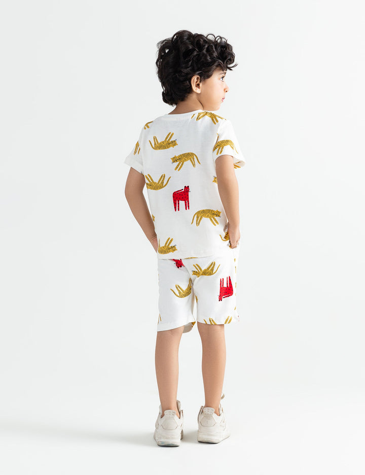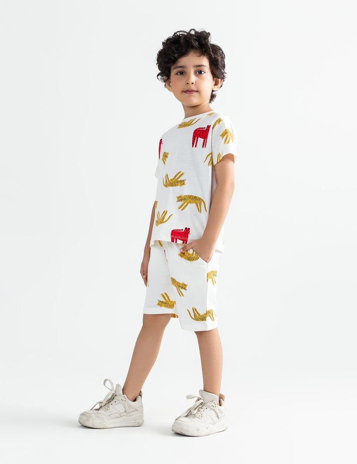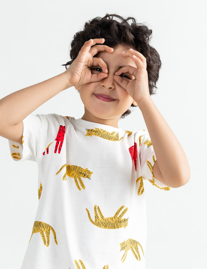 Bring out his wild side with this 2 Piece Allover Tiger Printed Suit for Little Boys. Featuring a playful tiger-printed top paired with matching bottoms, this outfit is both fun and stylish. Made from soft, breathable fabric, it offers comfort and durability, perfect for playtime, casual outings, or everyday adventures.