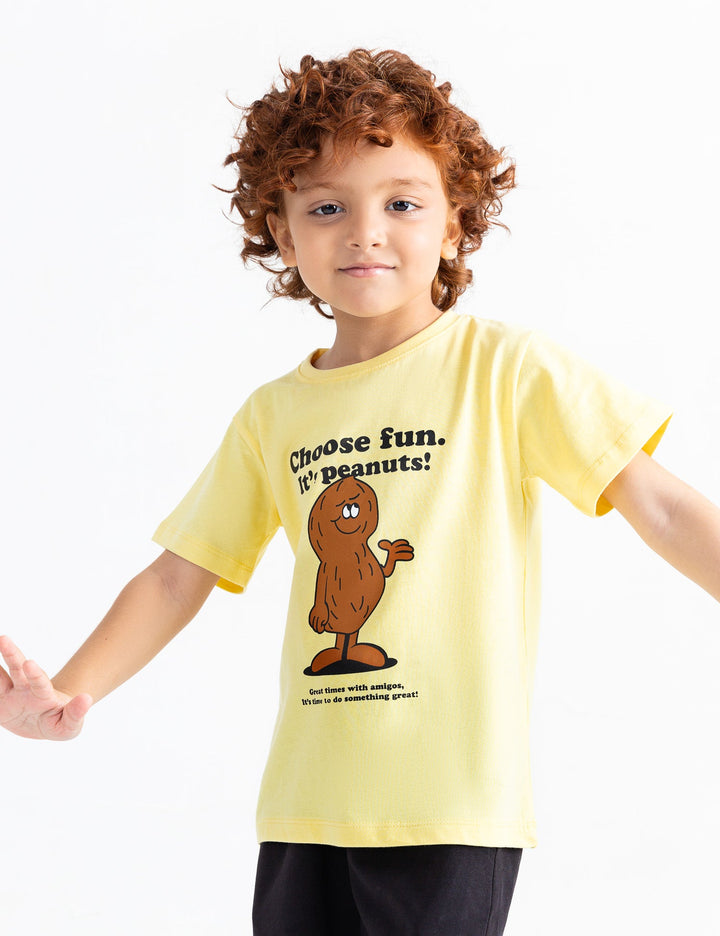 Add a playful touch to his casual wardrobe with this Choose Fun It's Peanuts Printed T-Shirt for little boys. Featuring a cheerful Peanuts character print with the slogan “Choose Fun”, this tee is made from soft, breathable fabric to keep him comfy all day. Perfect for school, playdates, or weekend adventures, it’s a must-have for every Peanuts fan!