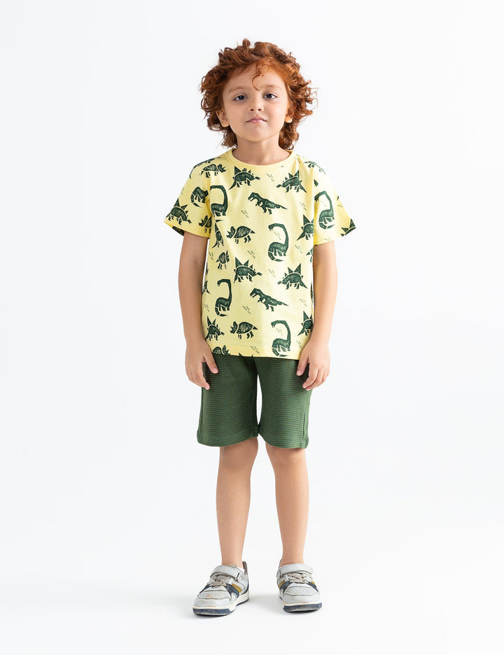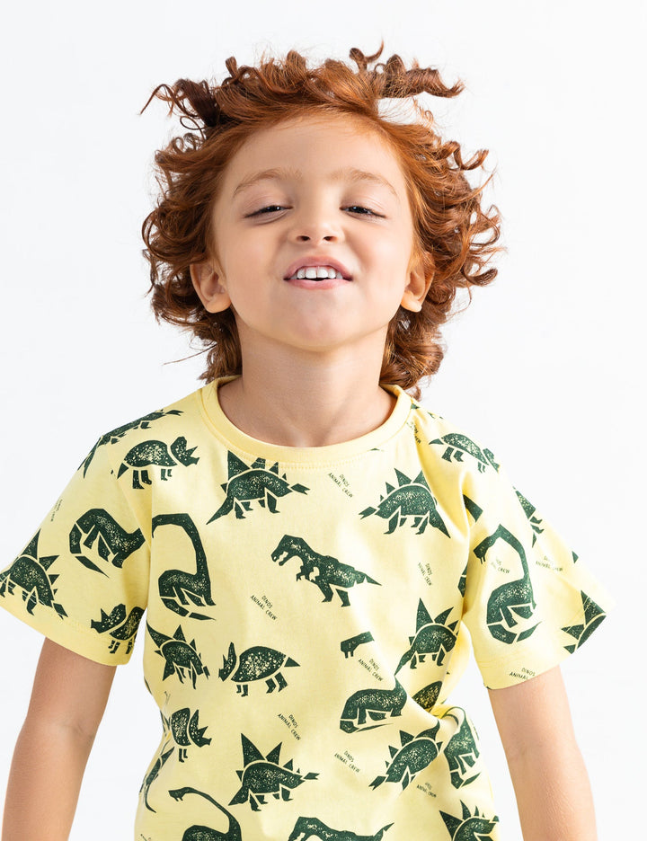 Bring fun and adventure to his everyday style with this Allover Dino's Animal Crew Printed T-Shirt for little boys. Designed with a playful mix of dinosaurs and animal crew prints, this tee adds a lively touch to his casual outfits. Made with soft and breathable fabric, it ensures all-day comfort whether he’s at play, school, or on a family outing. A perfect pick for little explorers who love dinos and animals!