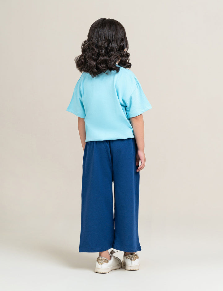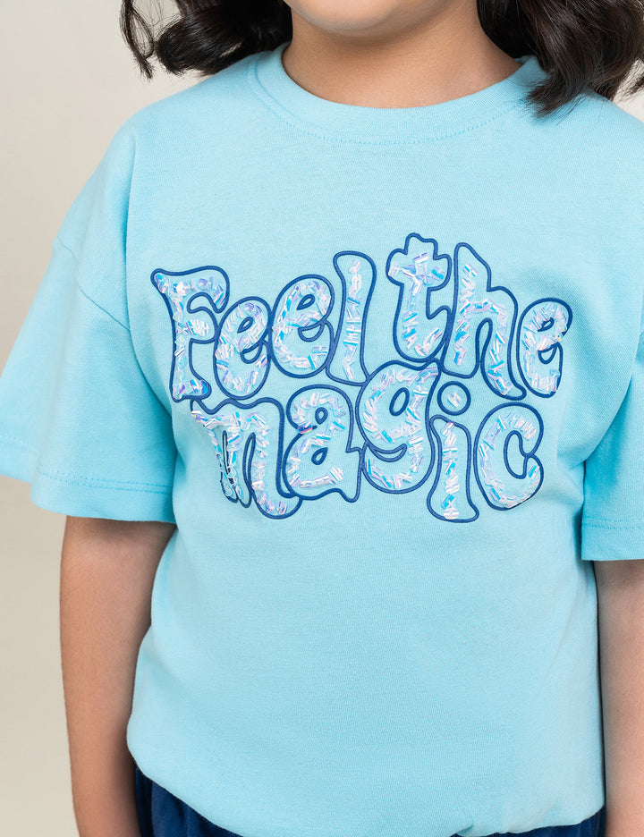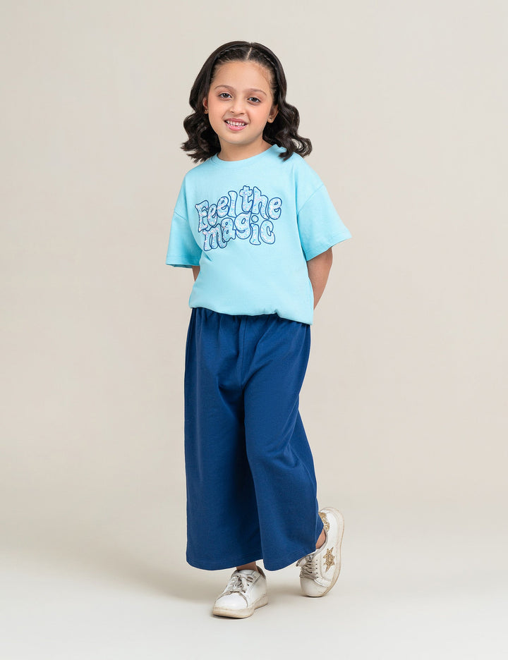 Let your little girl shine in this charming 2-piece “Feel The Magic” printed suit. The outfit includes a light blue short-sleeve top with a colorful “Feel The Magic” graphic and an adjustable drawstring waist, paired with comfortable navy blue knee-length bottoms. Perfect for playtime, outings, or casual days, this set combines comfort and style effortlessly.