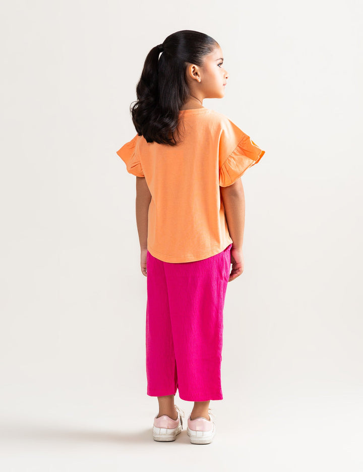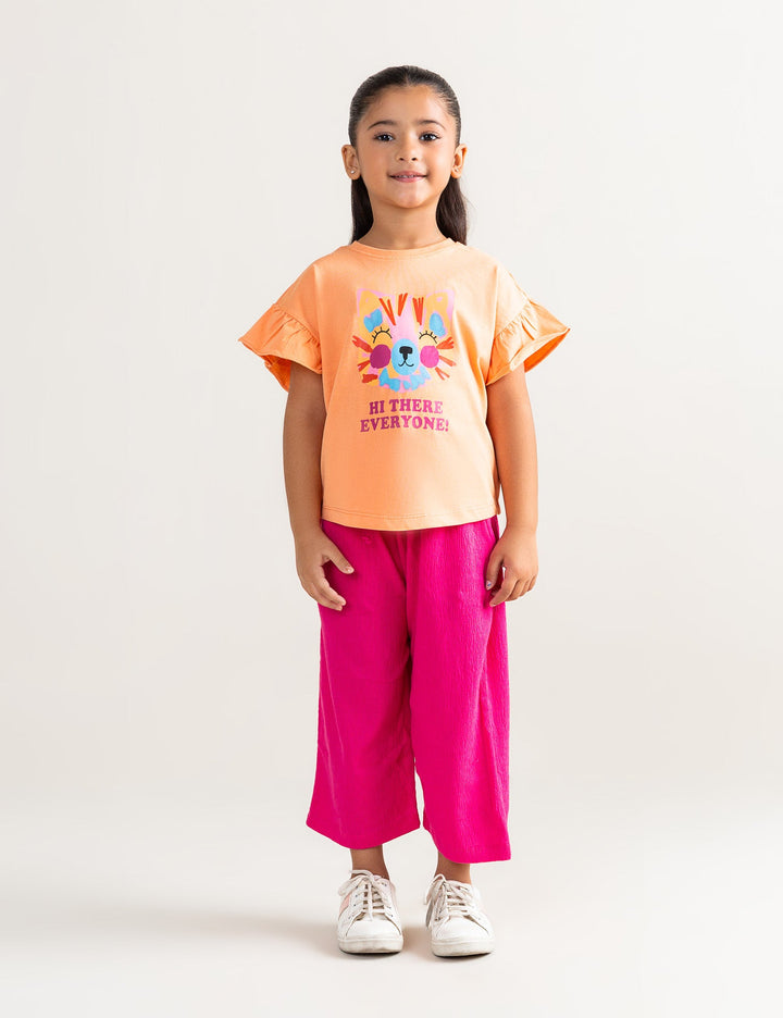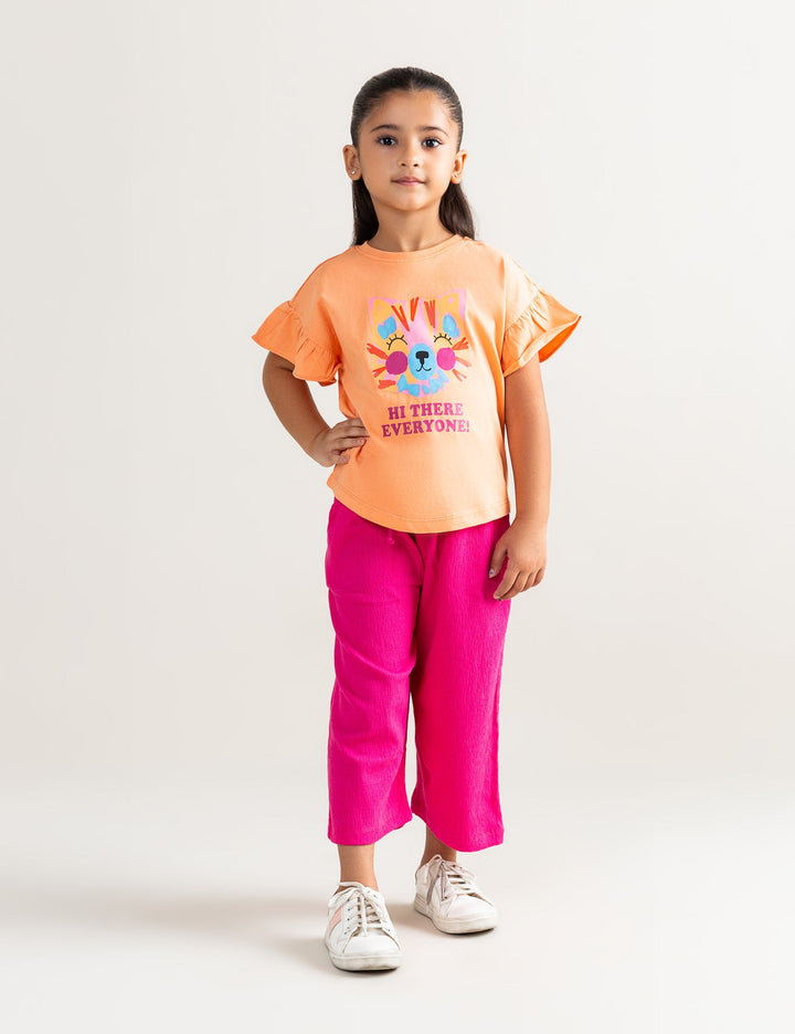 Brighten up your little girl’s wardrobe with this Hi There Everyone Cat Graphic T-Shirt. Featuring a colorful cat face graphic with playful text, this tee is both fun and stylish. The short ruffle sleeves and soft fabric ensure comfort while adding a touch of charm, making it perfect for everyday wear, school, or casual outings.