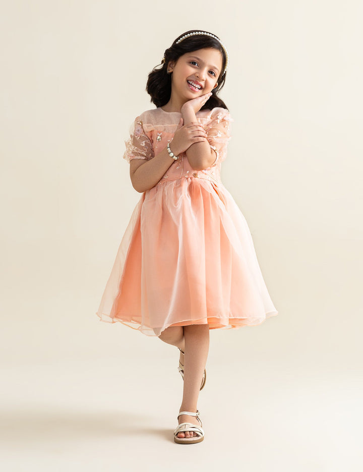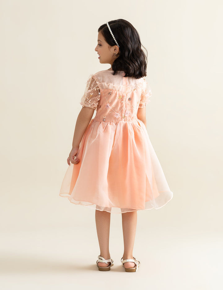 Make her special moments even more magical with this floral embroidered party dress for little girls. Designed in a soft blush pink shade, it features delicate floral embroidery on the bodice and sheer puff sleeves for a dreamy, elegant look. The flowy layered skirt adds graceful movement, making it perfect for birthdays, weddings, and festive celebrations.