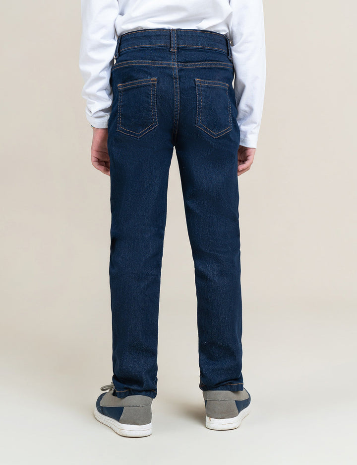 Keep it cool and casual with these Classic Dark Wash Denim Jeans for Boys. Designed with a timeless straight-fit silhouette, these jeans feature a sturdy fabric, neat contrast stitching, and a comfortable waistband for everyday wear. Perfect for pairing with t-shirts, polos, or hoodies, these jeans are a versatile wardrobe essential for school days, outings, and playtime alike.