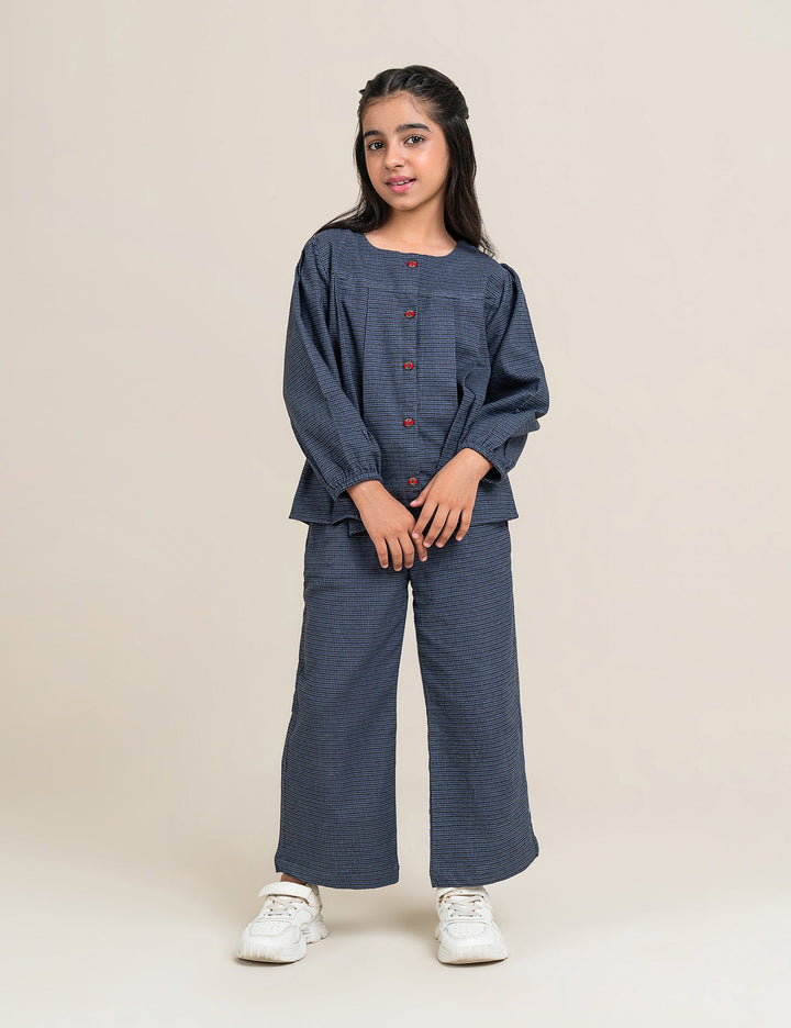 This stylish girls’ two-piece set features a charming checkered pattern with a button-down top and matching pants. The top is designed with eye-catching red buttons that add a fun pop of color, along with gathered details for a soft, comfortable fit. The coordinating pants come with an elastic waistband for easy wear and flexibility. Perfect for casual outings, family gatherings, or everyday comfort, this outfit offers a blend of classic style and cozy practicality.