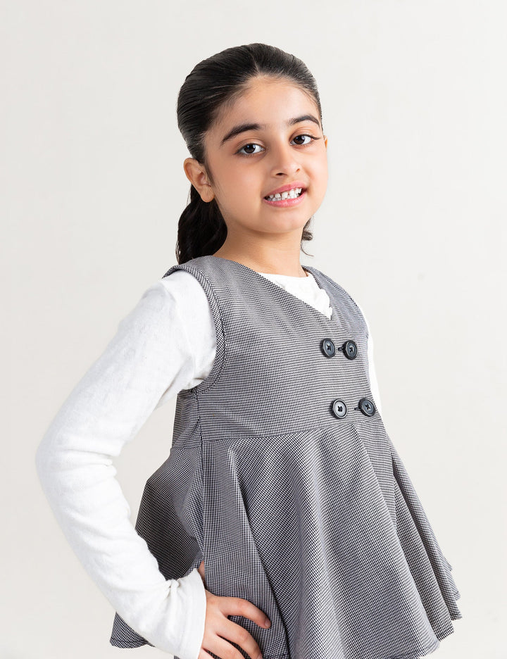 This stylish girls’ two-piece set includes a grey checkered sleeveless peplum top with double-button detailing and matching elastic-waist pants. The peplum design adds a cute, flared touch, while the soft and breathable fabric ensures comfort all day long. Perfect for both casual outings and special occasions, this outfit combines classic style with playful charm. Pair with sandals or flats for a complete look.