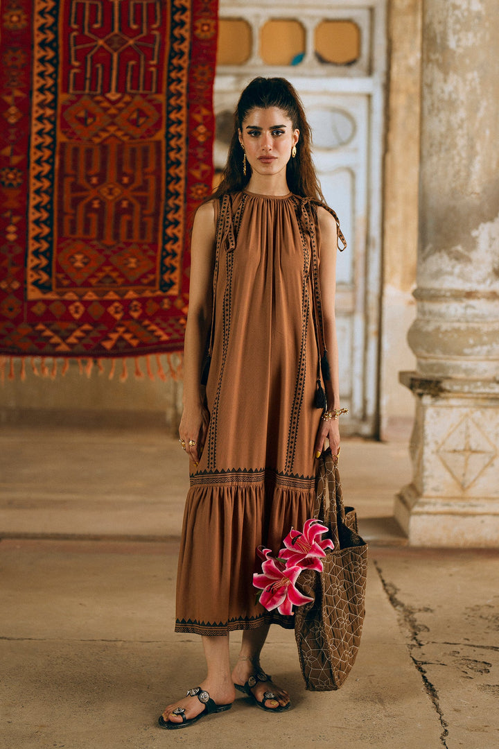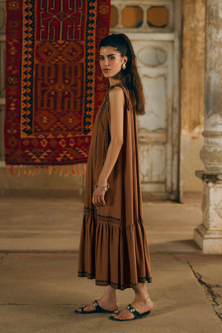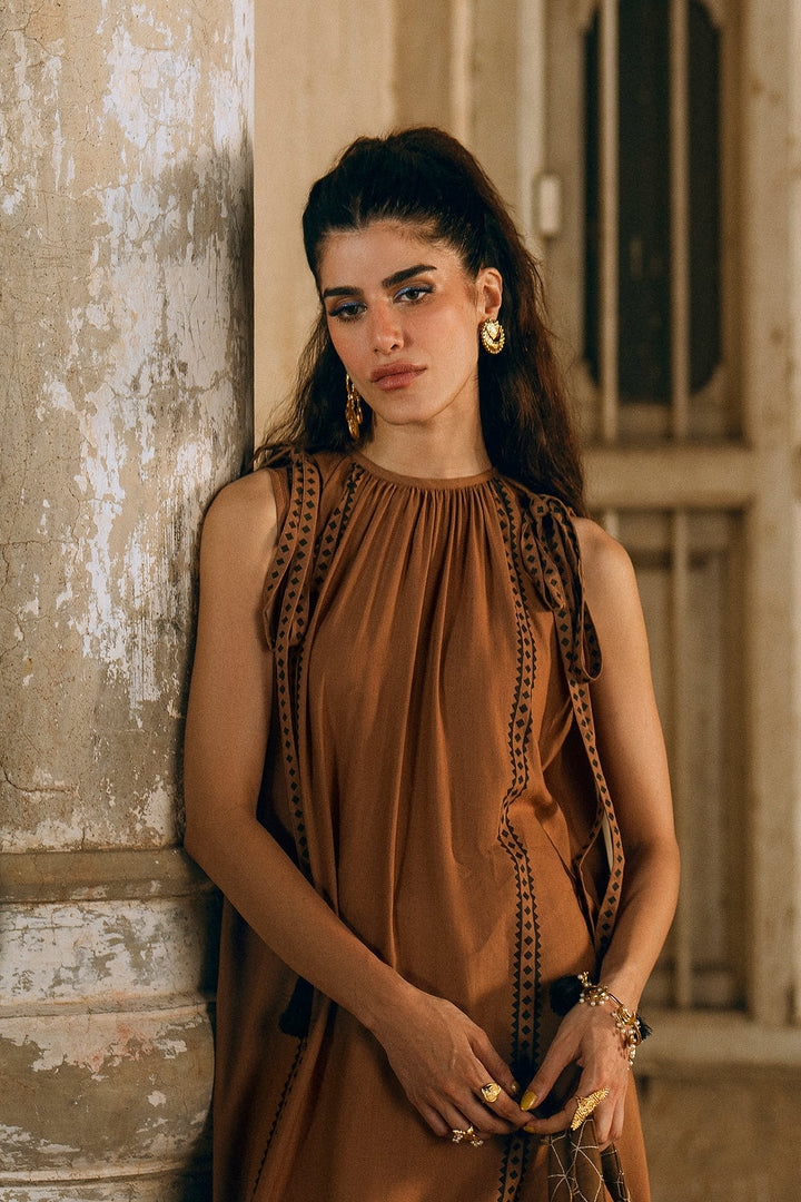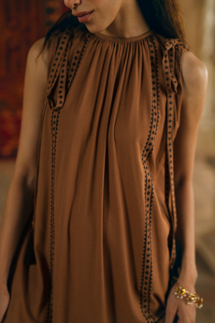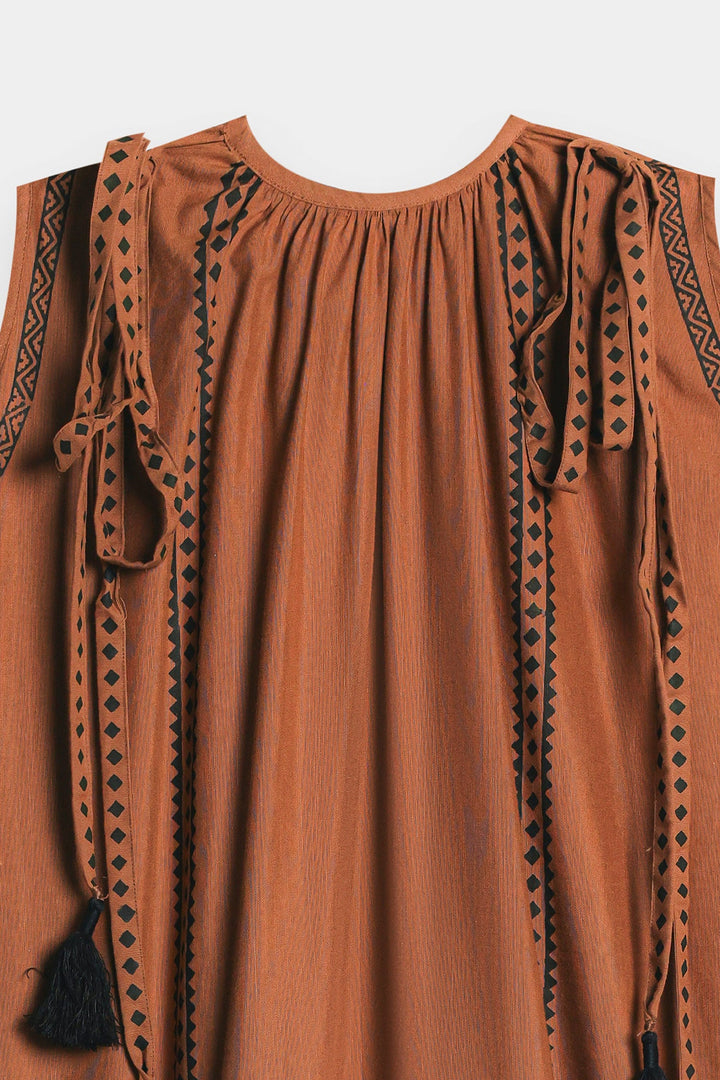 Grace any occasion with this beautiful brown dress. The sleeveless dress features a flattering silhouette with intricate black print on the bodice and a tiered skirt. The tassels at the neckline add a touch of bohemian charm, making it perfect for a stylish day out or a special event.