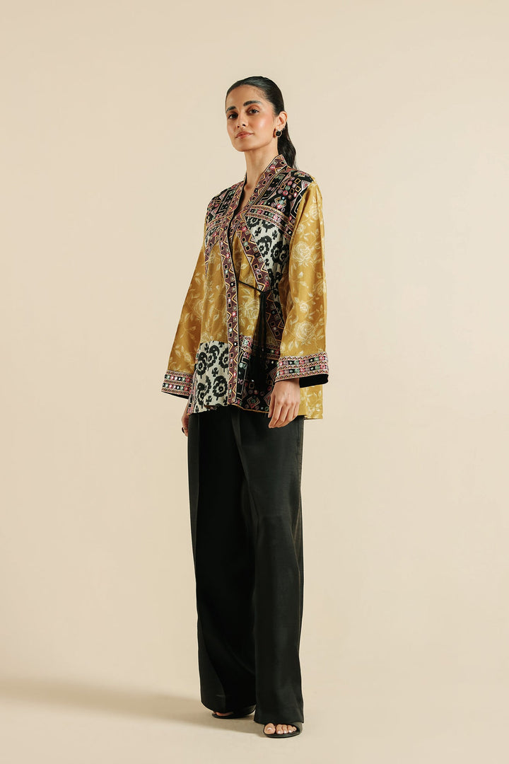 Style like a diva in this style statement outfit showcasing a contemporary front open kimono silhouette. Illustrating a classy oil shade canvas adorned with captivating prints in vibrant colors and beautifully enriched with aesthetically rich embroidery with artificial mirror details and geometric designs, this alluring outfit is a great option for fun gatherings this happening season.
