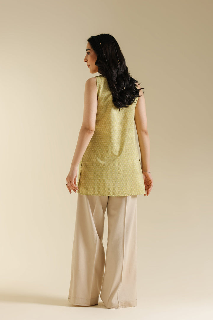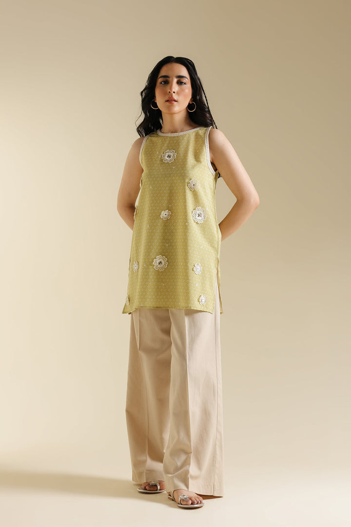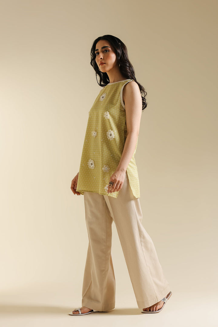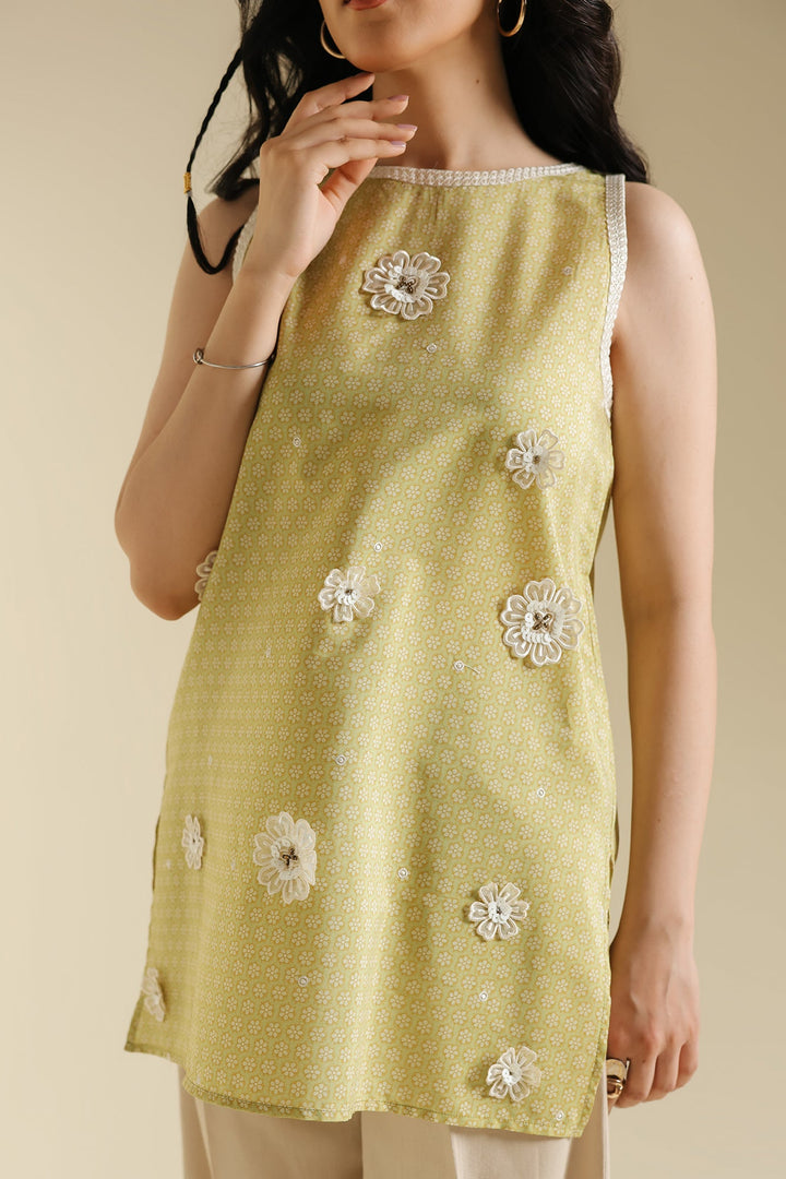 Be the epitome of grace and sophistication in this elegant kurti rendered in a bright apple green shade. Crafted in a contemporary sleeveless silhouette and adorned with beautiful floral prints and enriched with aesthetically rich embroidery with captivating floral designs in ivory white hues, this classy kurti is a must have to style at day occasions this happening season.