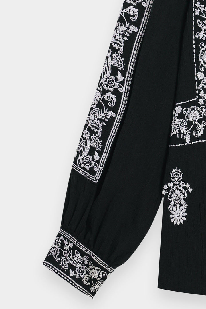 Wrap yourself in classic elegance with this sophisticated black and white embroidered kurti. This beautiful top features intricate white embroidery that creates a striking contrast against the dark fabric. The detailed floral patterns cover the chest and sleeves, and the tassel ties at the neckline add a touch of traditional charm. Perfect for a special occasion or a stylish day out, this kurti offers a blend of timeless style and modern comfort.