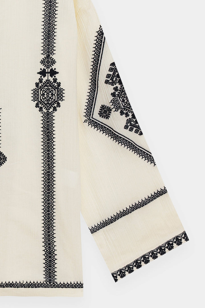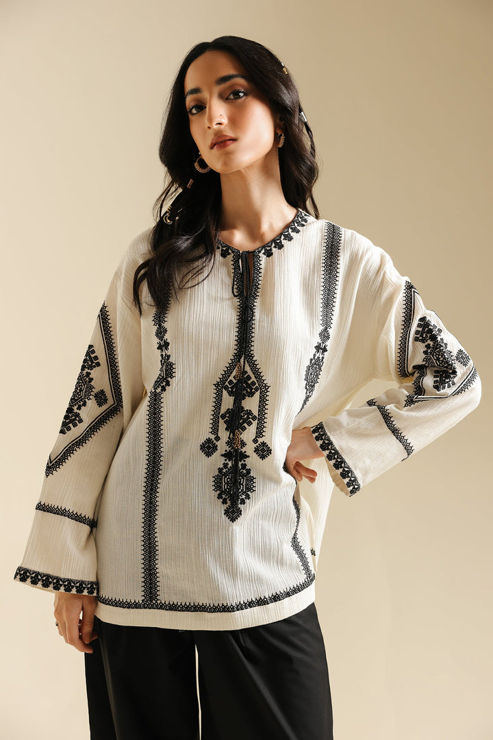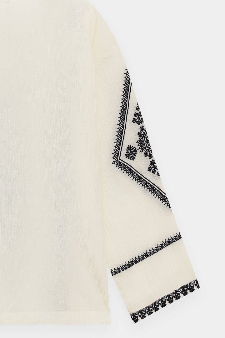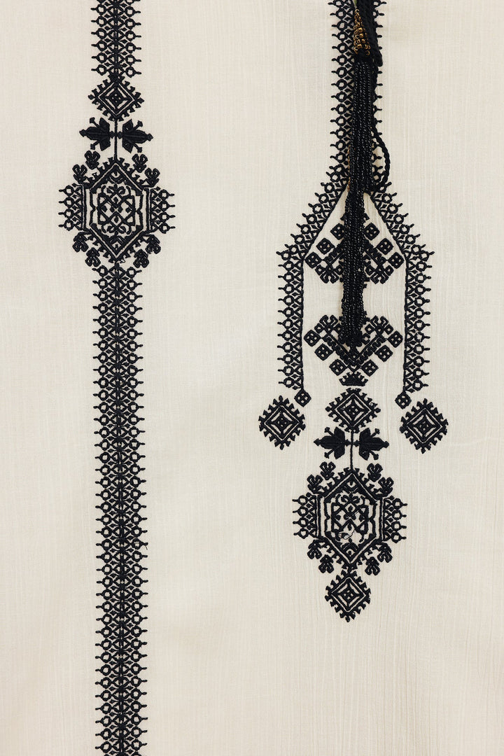 Unveil striking folk-inspired charm in this crisp white Kurti. This short, textured white kurti features beautiful black thread embroidery in dense geometric and intricate patterned motifs across the yoke, shoulders, and cuffs. The neckline is detailed with decorative black tassels, and the voluminous sleeves drape effortlessly. The high-contrast black embroidery on the white fabric creates an immediate and sophisticated style statement.