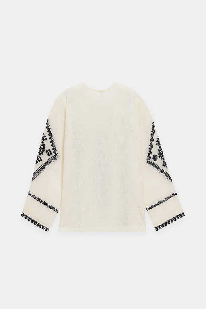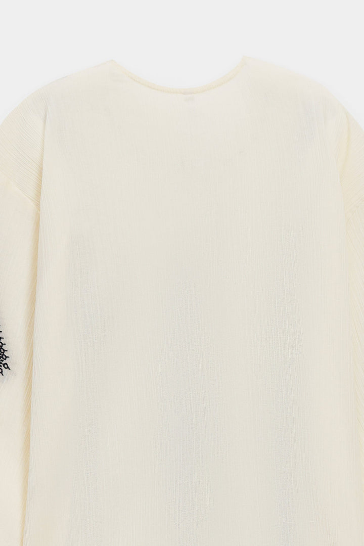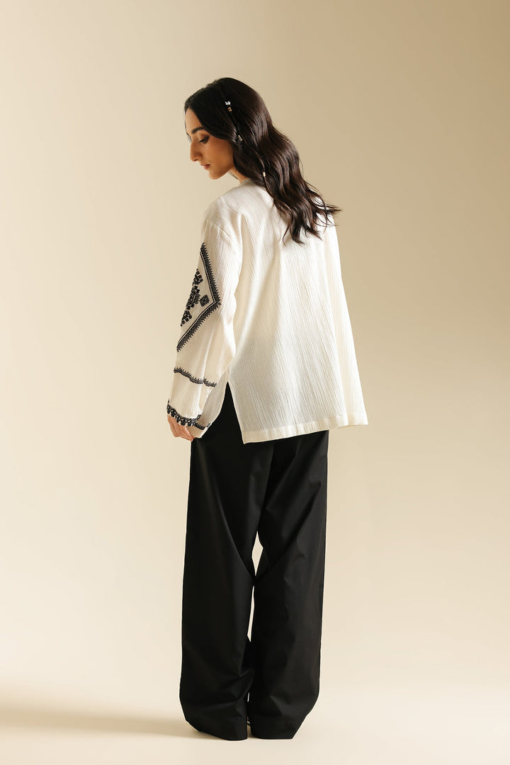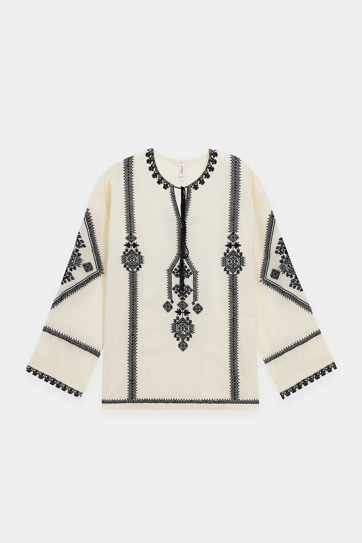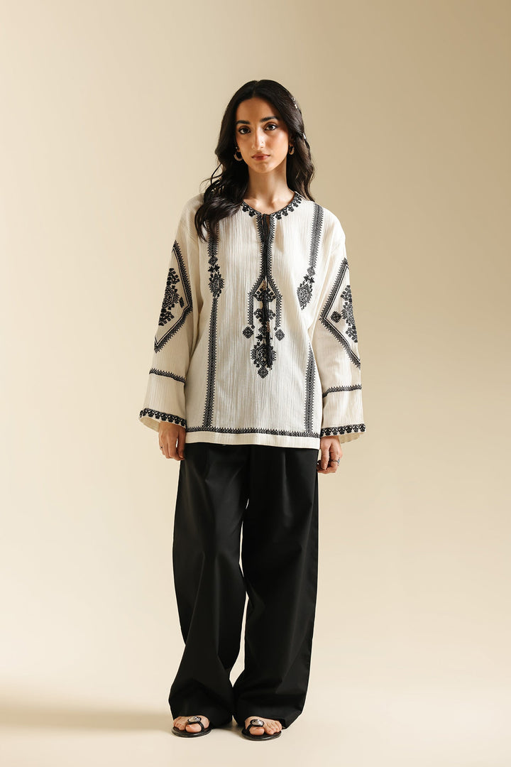 Unveil striking folk-inspired charm in this crisp white Kurti. This short, textured white kurti features beautiful black thread embroidery in dense geometric and intricate patterned motifs across the yoke, shoulders, and cuffs. The neckline is detailed with decorative black tassels, and the voluminous sleeves drape effortlessly. The high-contrast black embroidery on the white fabric creates an immediate and sophisticated style statement.