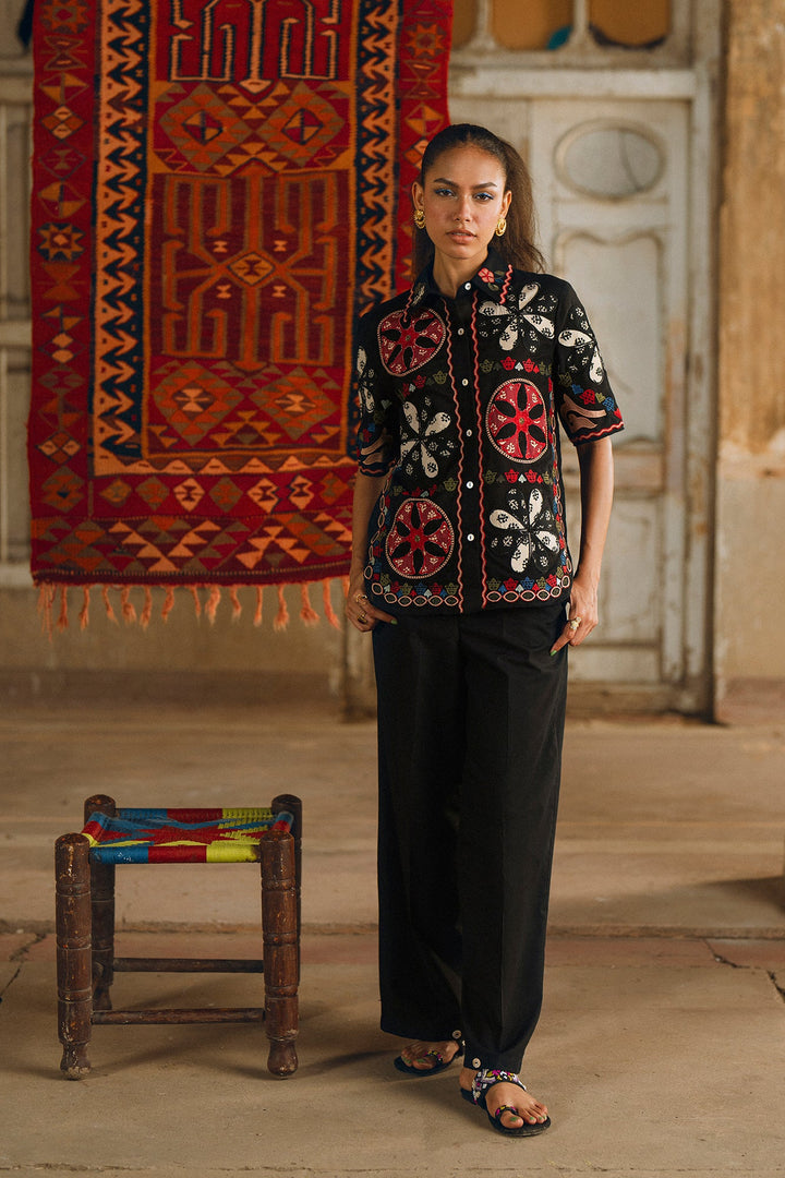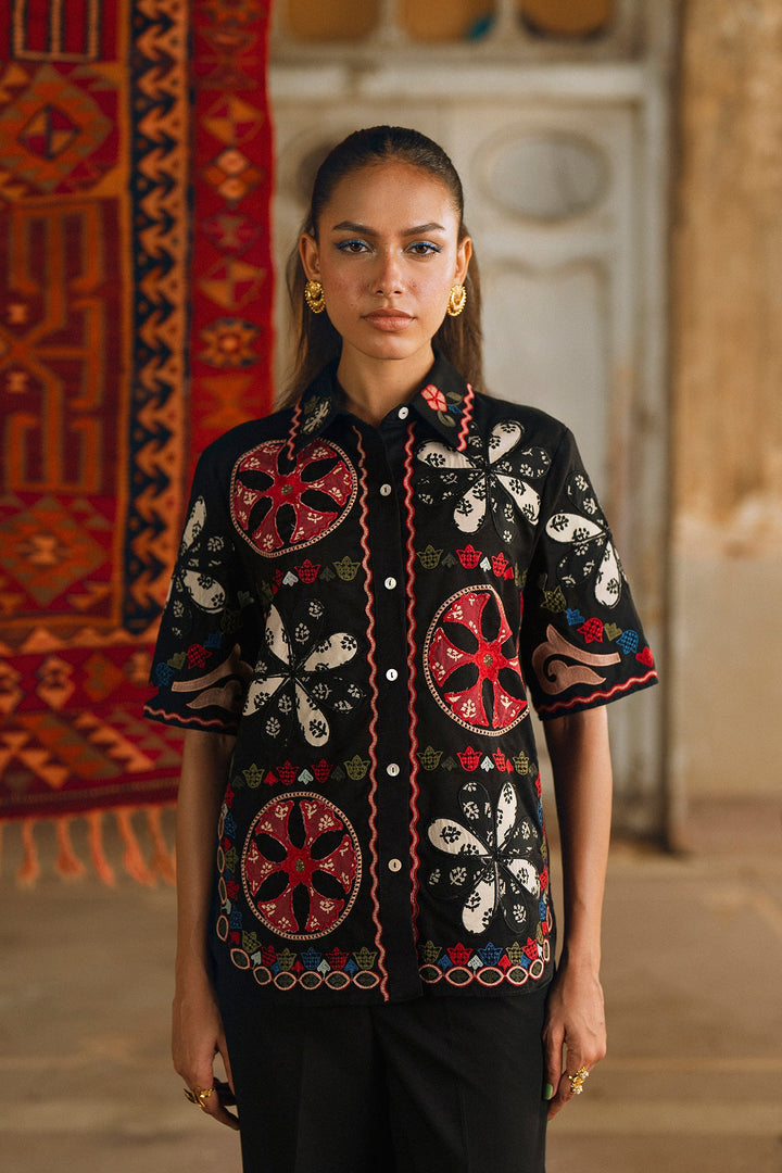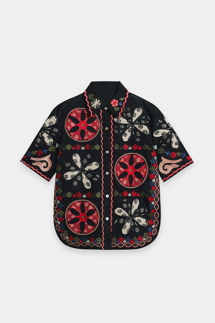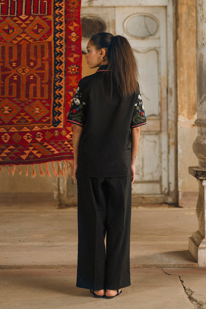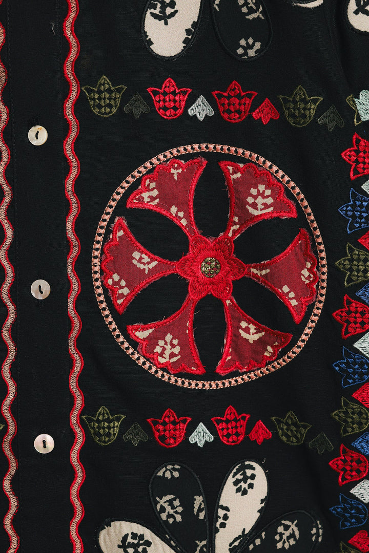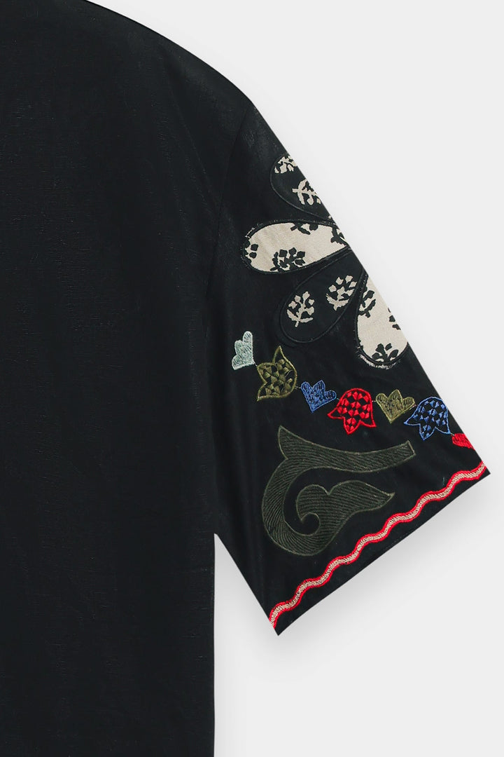 Make a bold statement in this stunning black kurti! This piece is a work of art, featuring a vibrant and intricate embroidered pattern with floral and geometric motifs in shades of red, white, and blue. The short-sleeved silhouette offers a modern feel, while the detailed embroidery adds a touch of traditional elegance. This top is perfect for a festive occasion or a stylish day out, blending contemporary fashion with rich, artisanal design.
