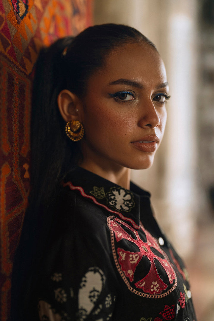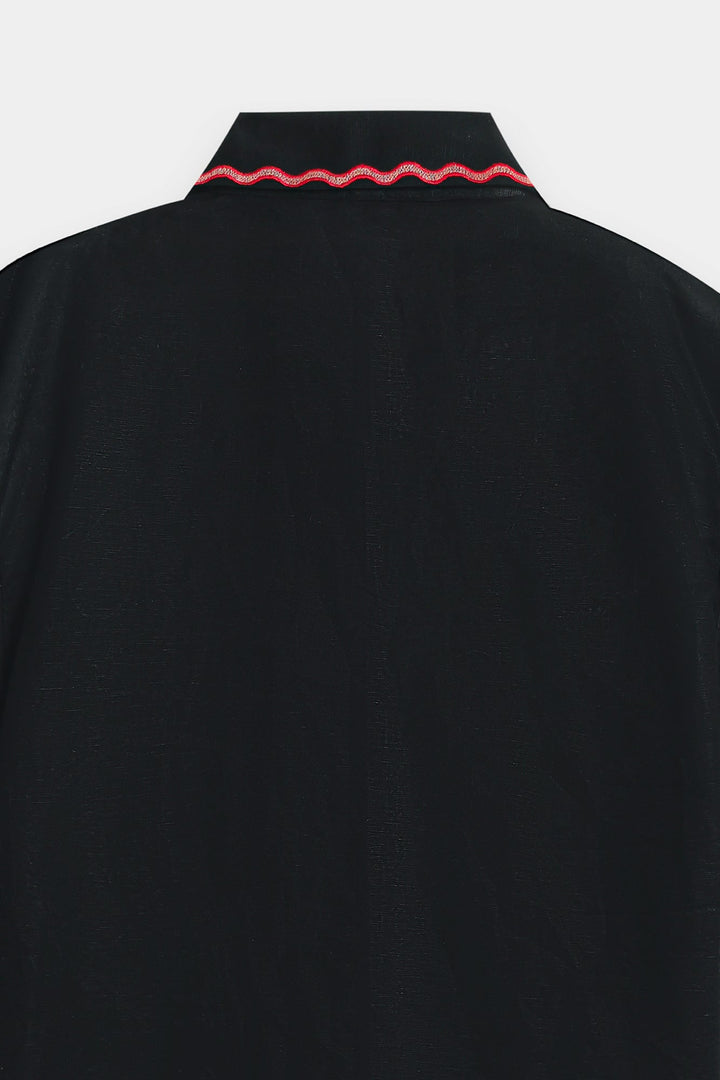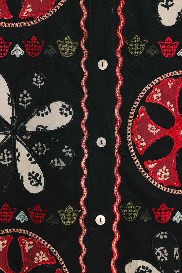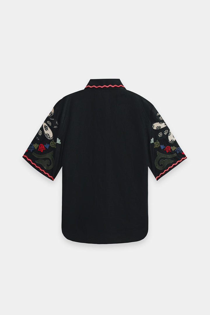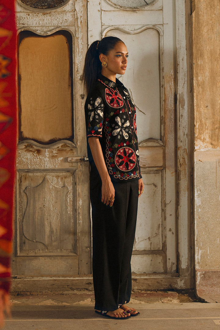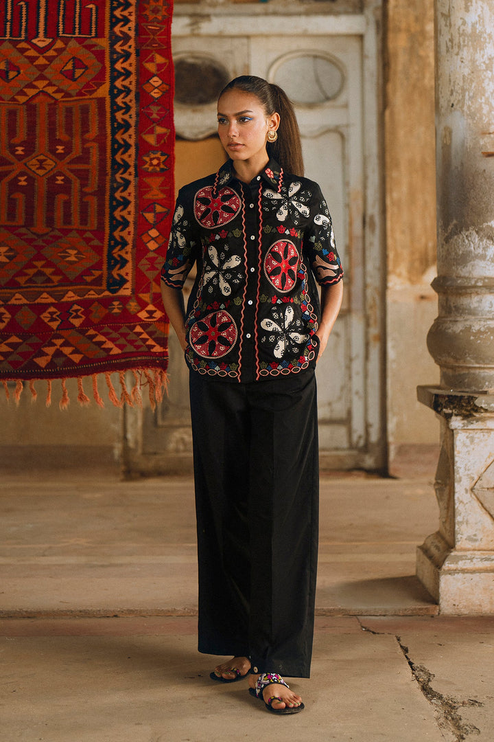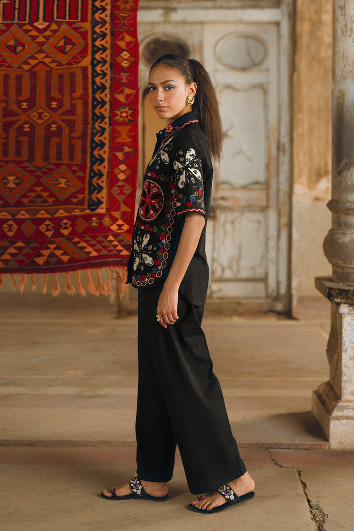 Make a bold statement in this stunning black kurti! This piece is a work of art, featuring a vibrant and intricate embroidered pattern with floral and geometric motifs in shades of red, white, and blue. The short-sleeved silhouette offers a modern feel, while the detailed embroidery adds a touch of traditional elegance. This top is perfect for a festive occasion or a stylish day out, blending contemporary fashion with rich, artisanal design.