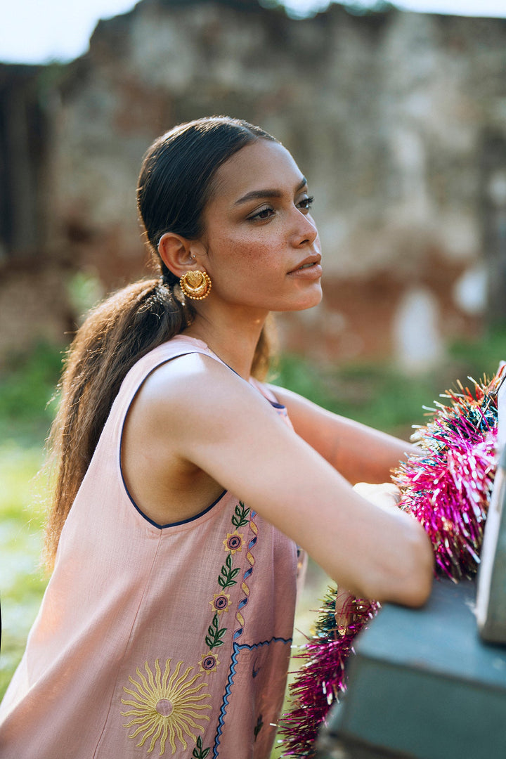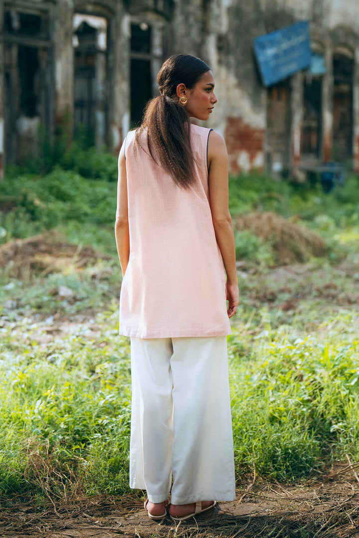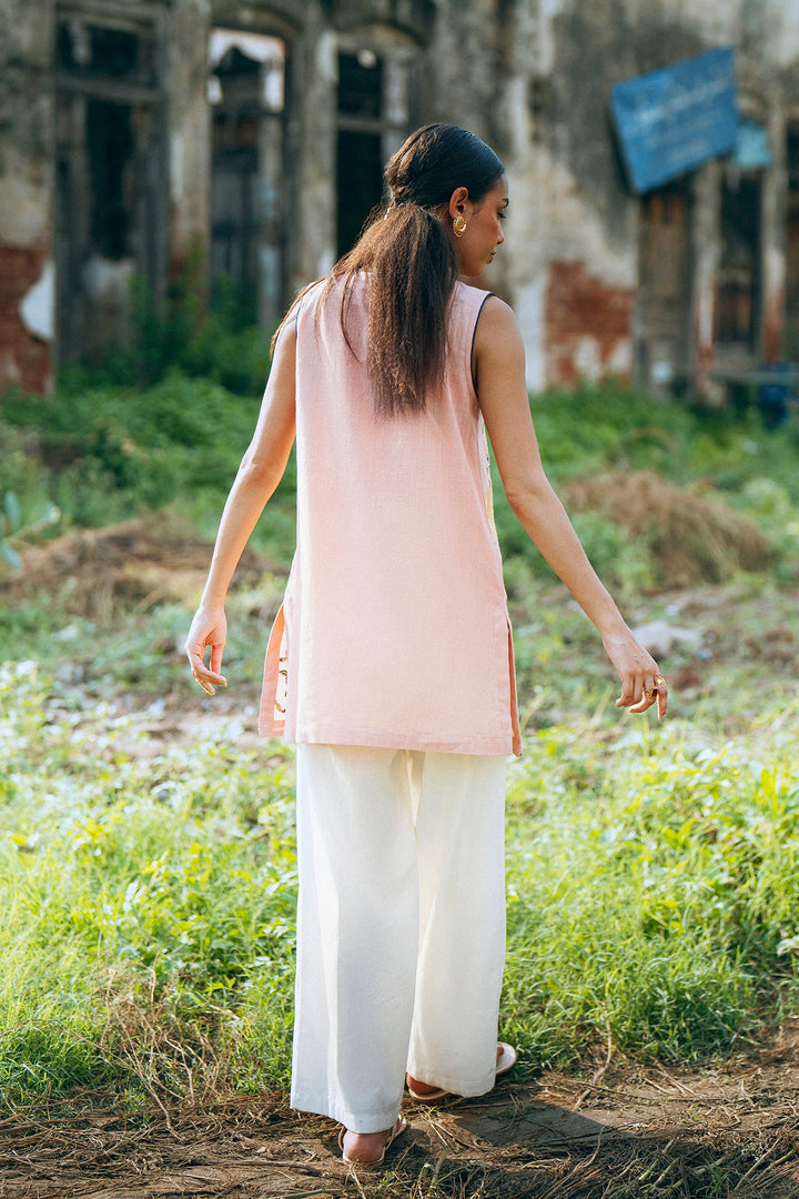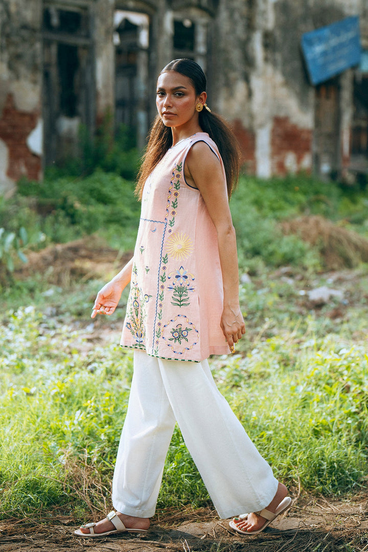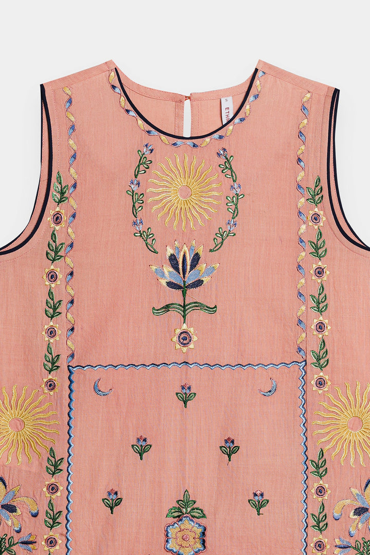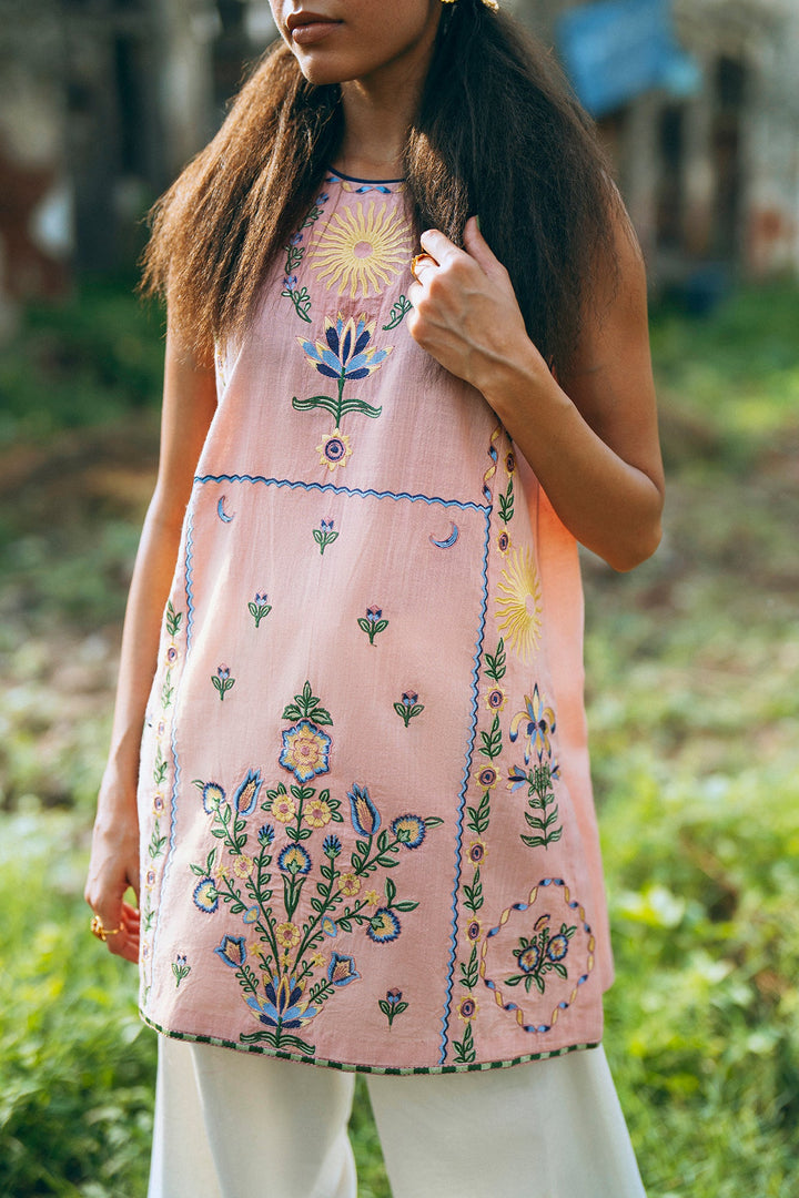 Adorn yourself in this elegant pastel pink sleeveless kurti! This beautiful top features intricate floral and paisley embroidery in shades of green and blue, creating a classic and artistic design. The relaxed silhouette ensures a comfortable fit, while the detailed pattern makes it a perfect choice for a festive occasion or a stylish day out.