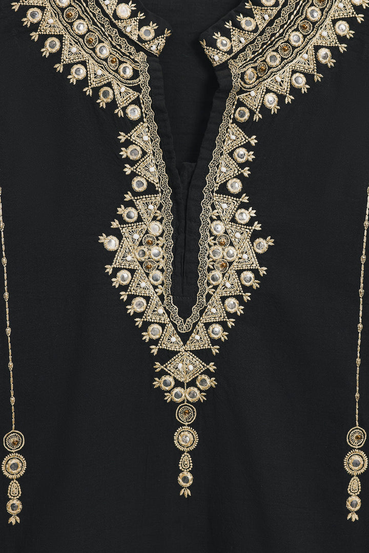 Exude understated chic in this black embroidered kurti. This short-length, long-sleeved kurti is crafted from a comfortable black fabric and features a band collar with a slit neckline. The silver and white thread embroidery forms beautiful traditional motifs across the yoke, neckline, and cuffs. The monochrome color scheme offers a versatile and sophisticated look. Pair this striking top with wide-leg beige or white trousers for a balanced and contemporary silhouette.