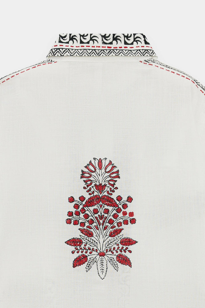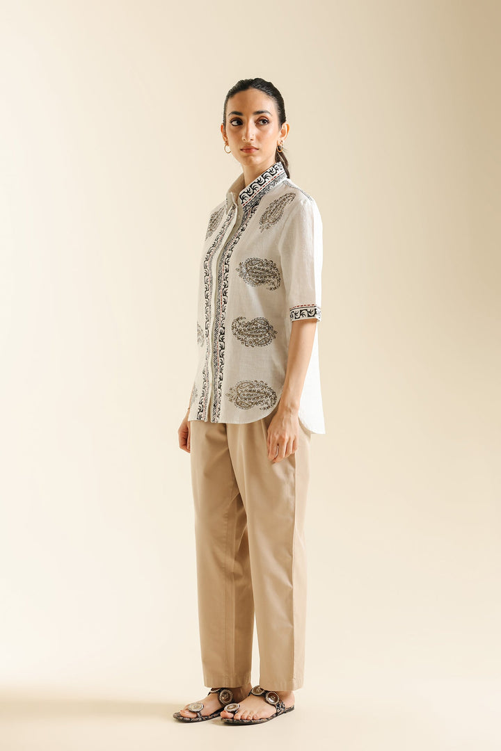 Elevate your casual wardrobe with the classic charm of this white printed kurti. This short-sleeved, straight-cut kurti is crafted from a crisp white fabric and features a classic collar with a button-down placket. It is beautifully adorned with intricate black and brown print, showcasing vertical panels of paisley and geometric patterns. This versatile kurti is shown paired with relaxed-fit, khaki-colored trousers, making it perfect for a polished, day-to-day look.