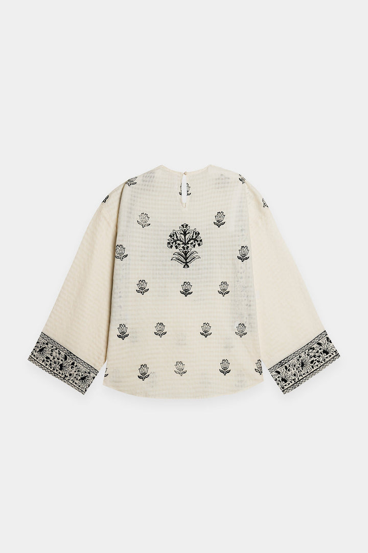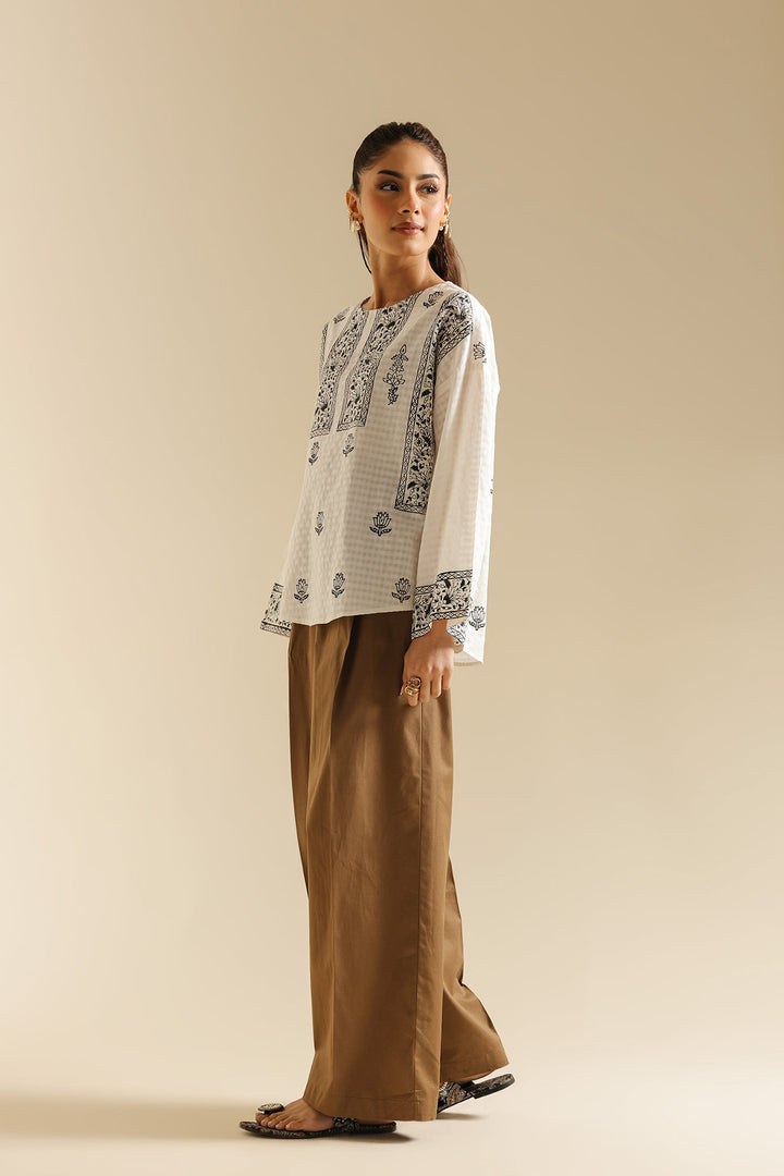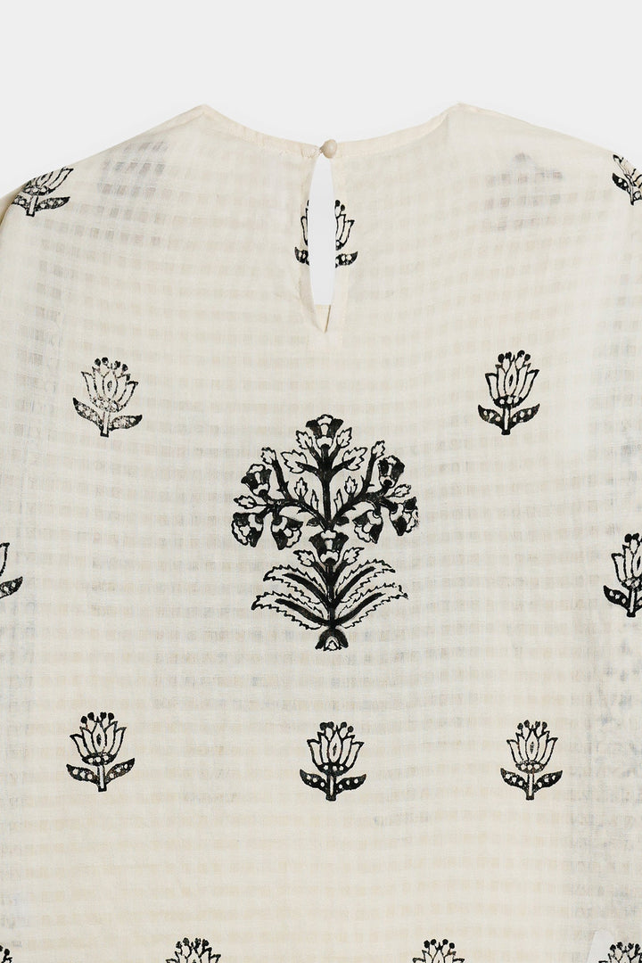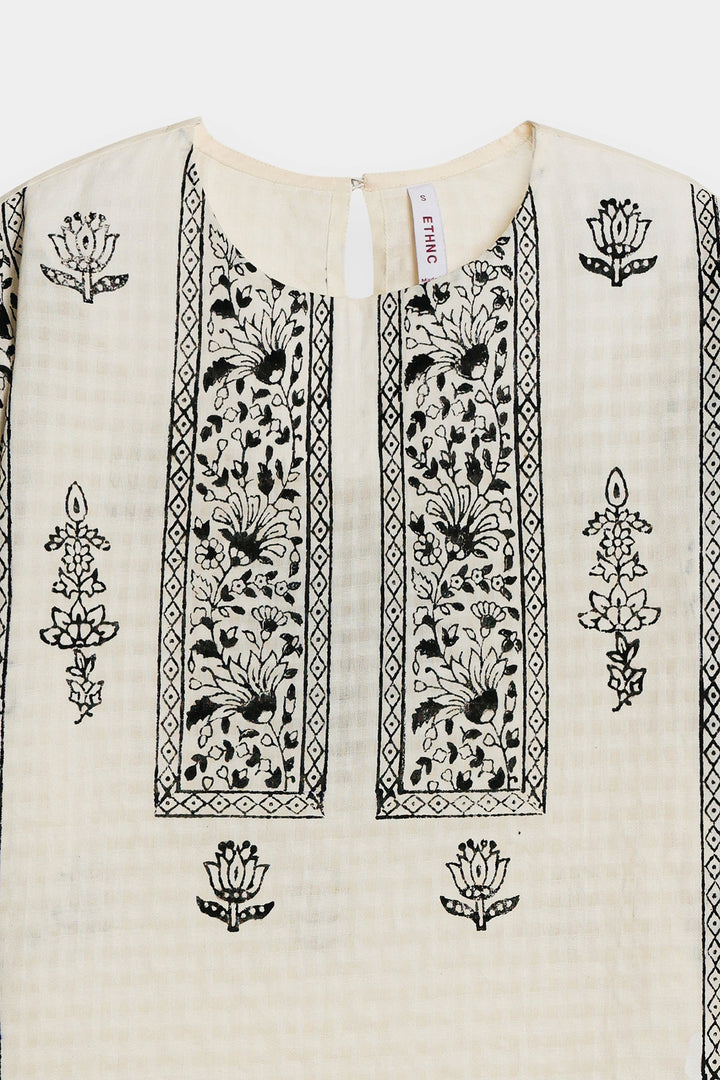 Add a touch of elegant charm to your wardrobe with this beautiful white printed kurti. This top features intricate black print in classic floral and geometric patterns, creating a sophisticated and striking look. The relaxed fit and flowy sleeves ensure both comfort and style, making it a perfect choice for a special occasion or a chic day out.
