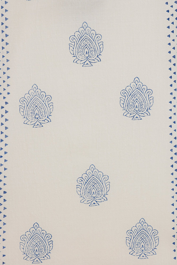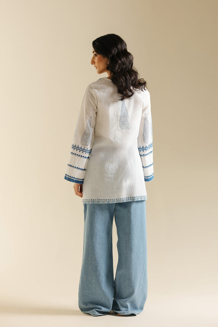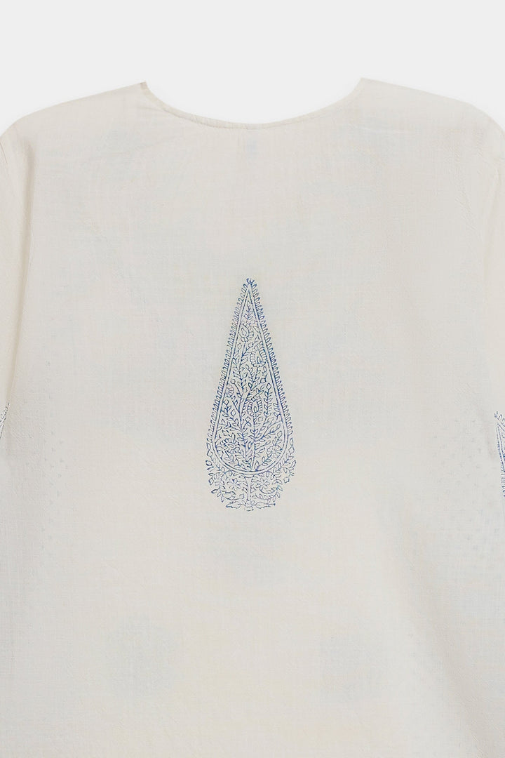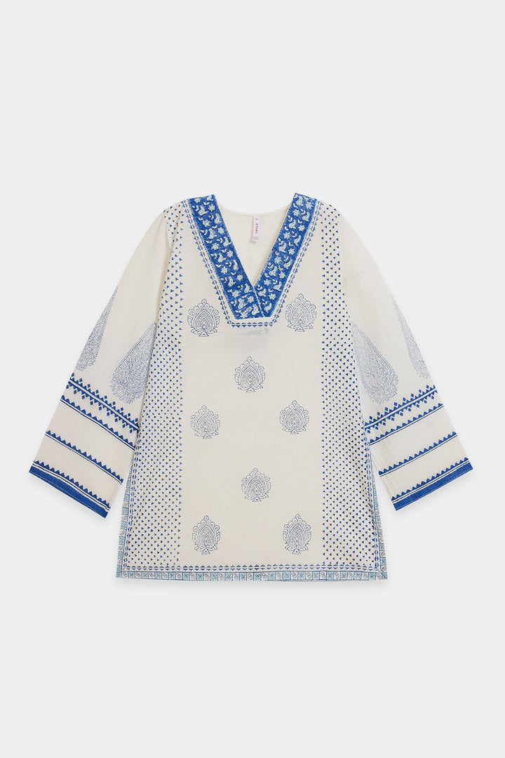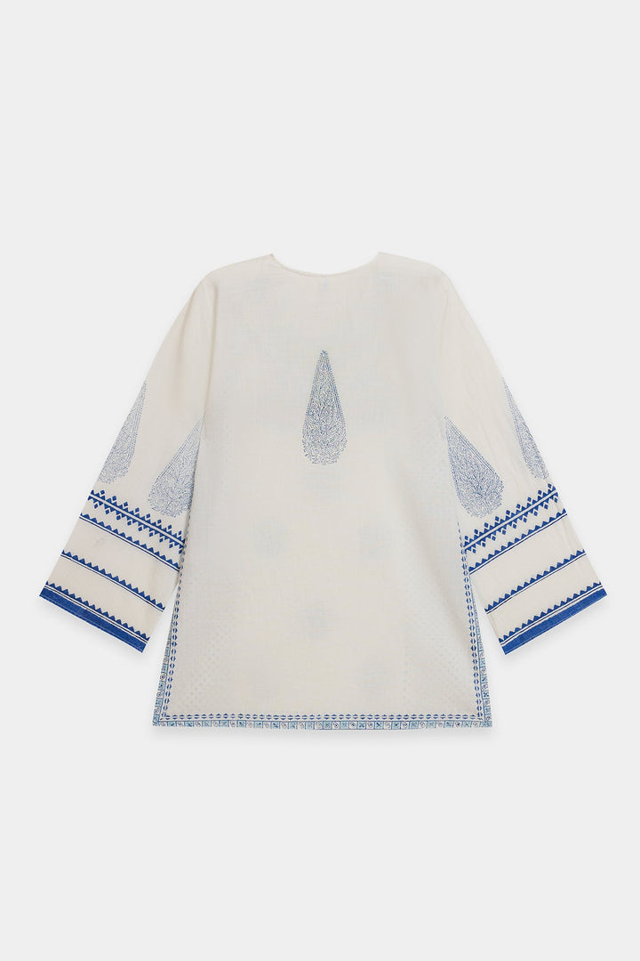 Capture a fresh, contemporary look with this stylish white and blue printed kurti. This short-length kurti is made from a breathable white fabric and features an all-over block-style print in indigo blue. The top is highlighted by traditional blue print detailing the V-neckline and the ends of the long, flared sleeves. For a trendy, high-impact ensemble, pair this top with distressed denim or wide-leg palazzo trousers.
