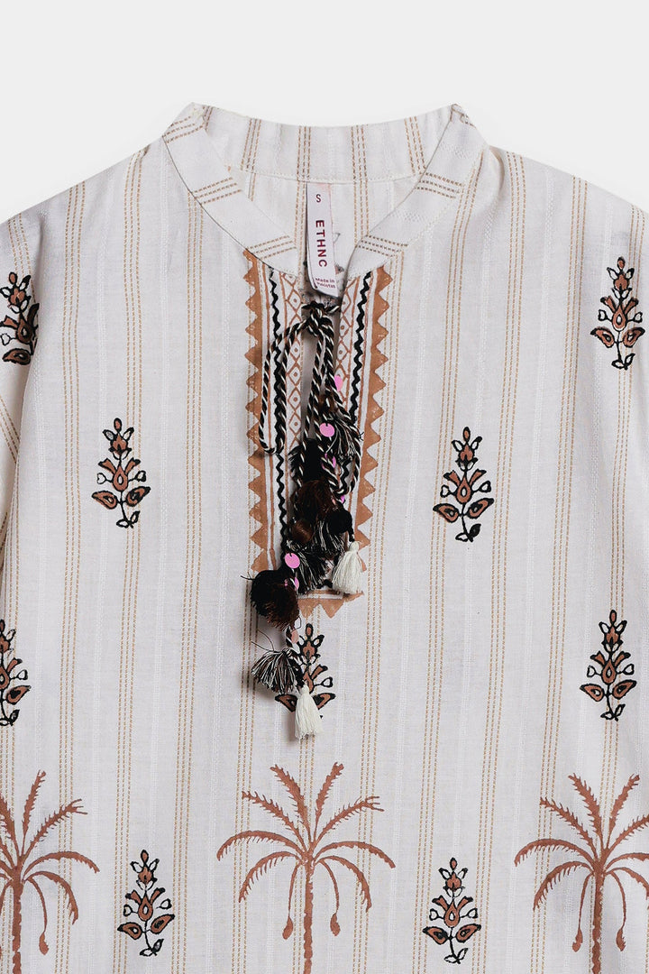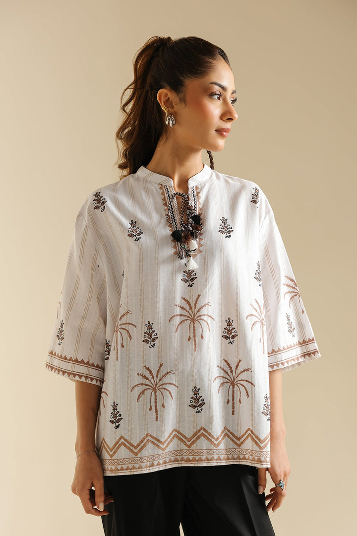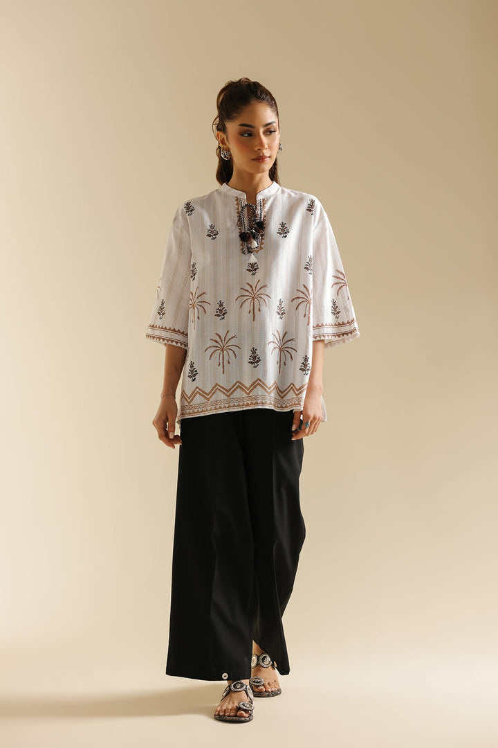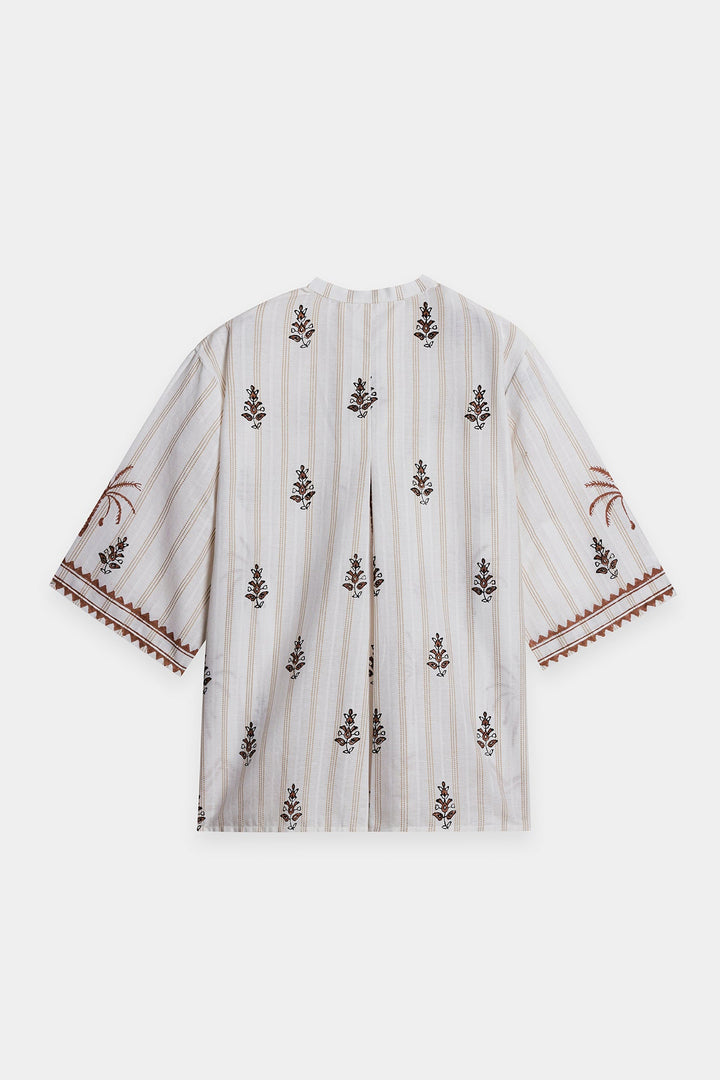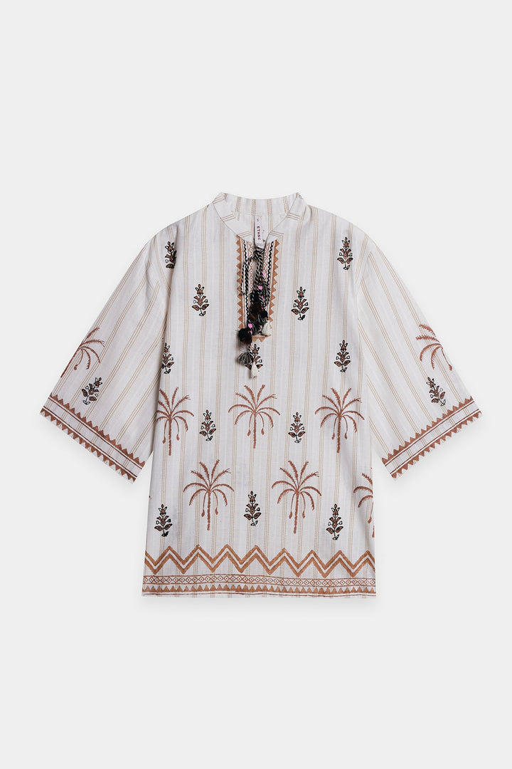 Add a touch of natural elegance to your wardrobe with this stylish white top. This piece features a charming pattern of repeating palm trees in shades of black and brown, creating a unique and sophisticated look. The relaxed fit and three-quarter sleeves make it a comfortable choice for any occasion, blending effortless style with a classic design.