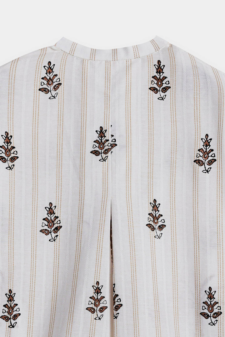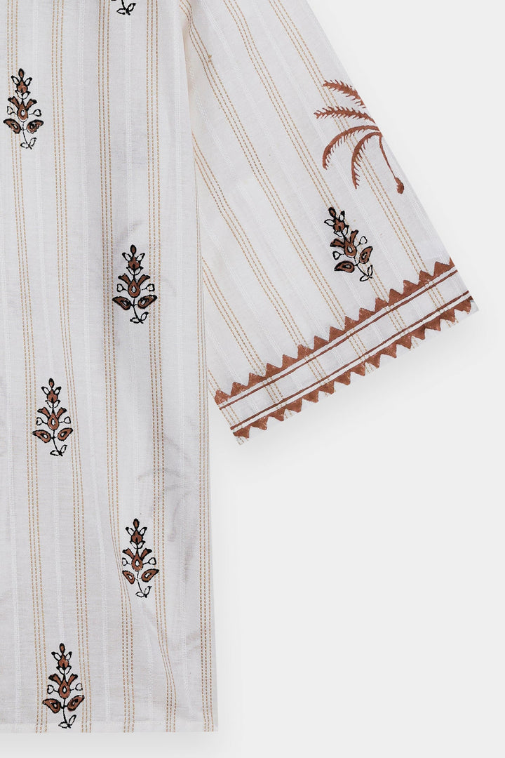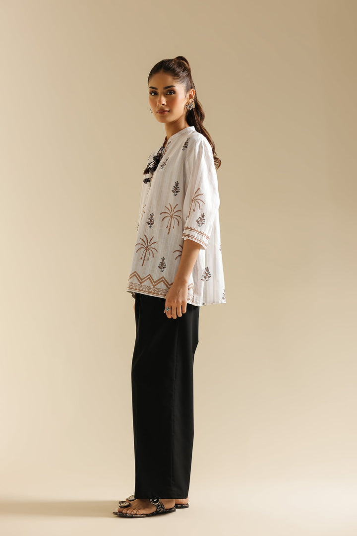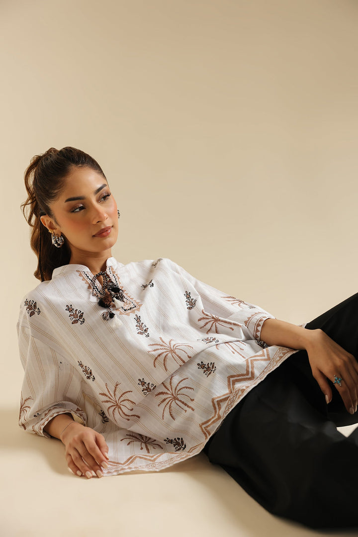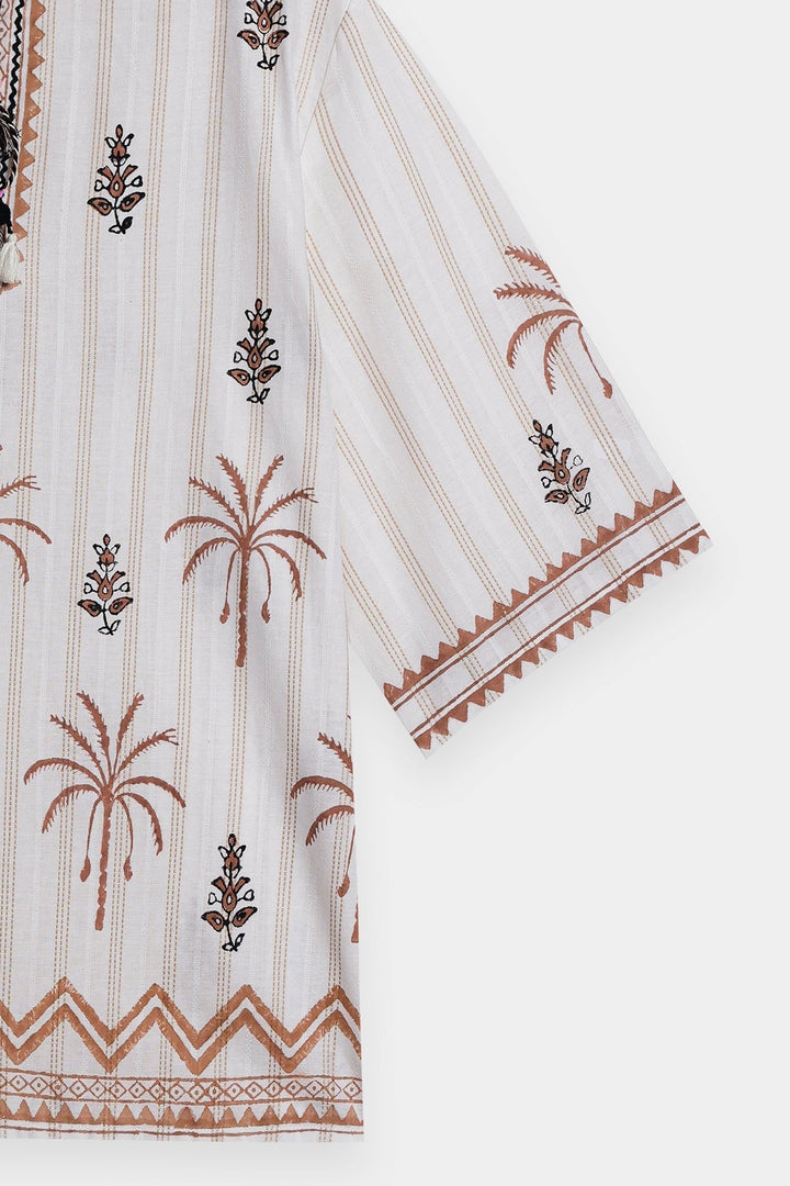 Add a touch of natural elegance to your wardrobe with this stylish white top. This piece features a charming pattern of repeating palm trees in shades of black and brown, creating a unique and sophisticated look. The relaxed fit and three-quarter sleeves make it a comfortable choice for any occasion, blending effortless style with a classic design.
