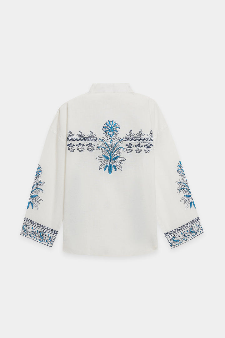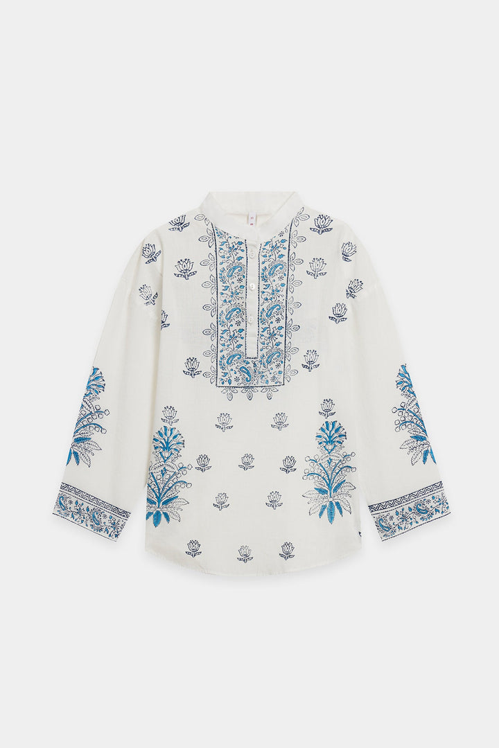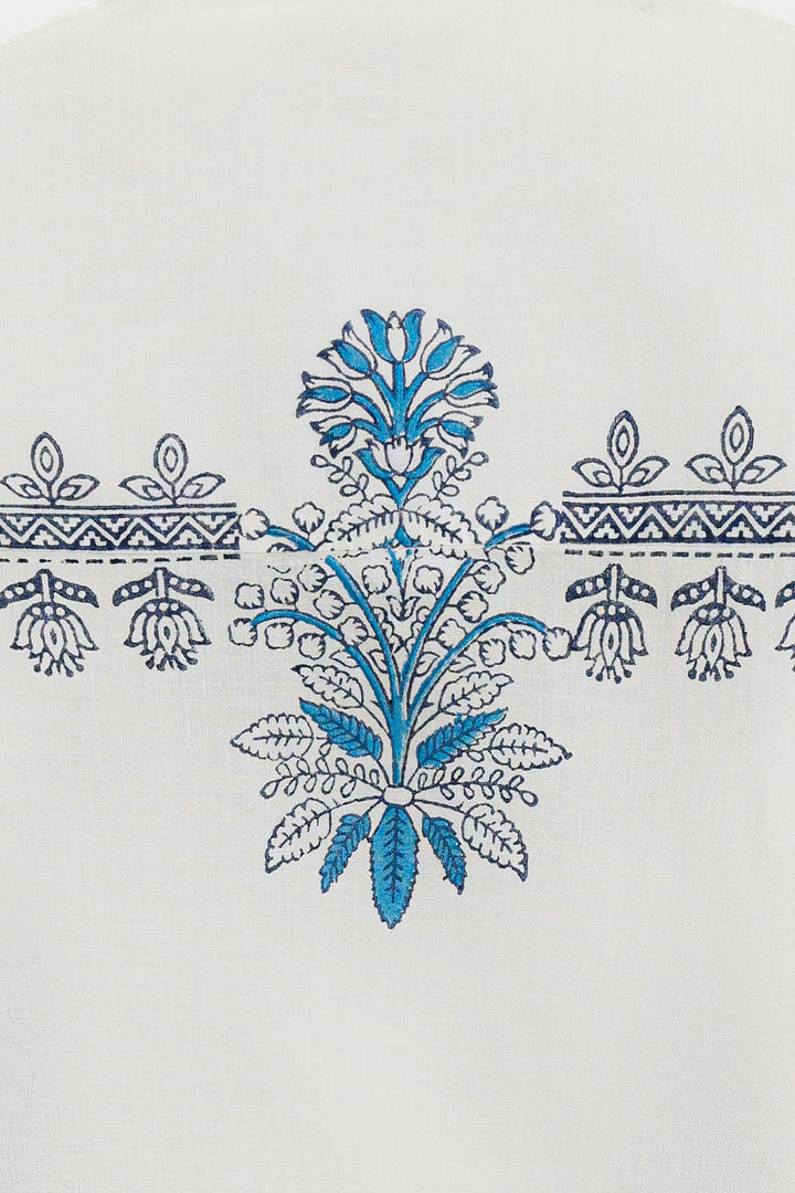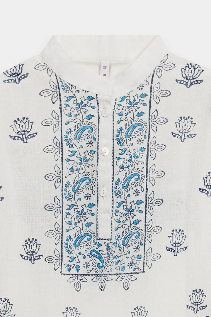 Add a fresh, breezy feel to your wardrobe with this stylish white printed kurti. This relax fit shirt is made from a crisp white fabric and features a band collar with a slit neckline. The entire top is adorned with beautiful, contrasting indigo blue print in traditional floral and botanical motifs. The print is concentrated around the yoke, shoulders, and the long sleeves. This elegant kurti offers a contemporary take on classic folk patterns, perfect for pairing with denim or embroidered trousers.