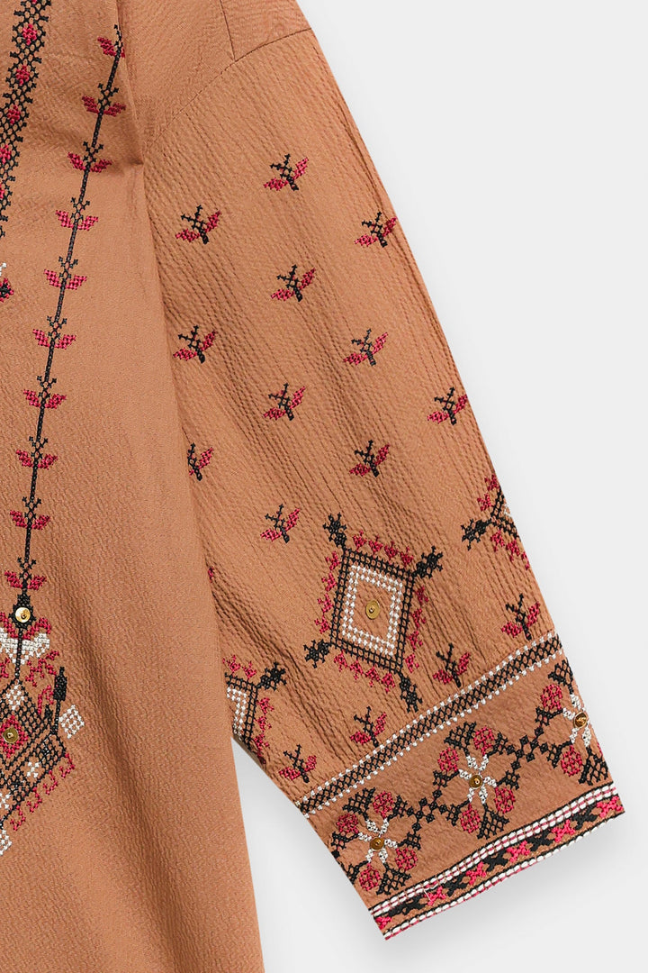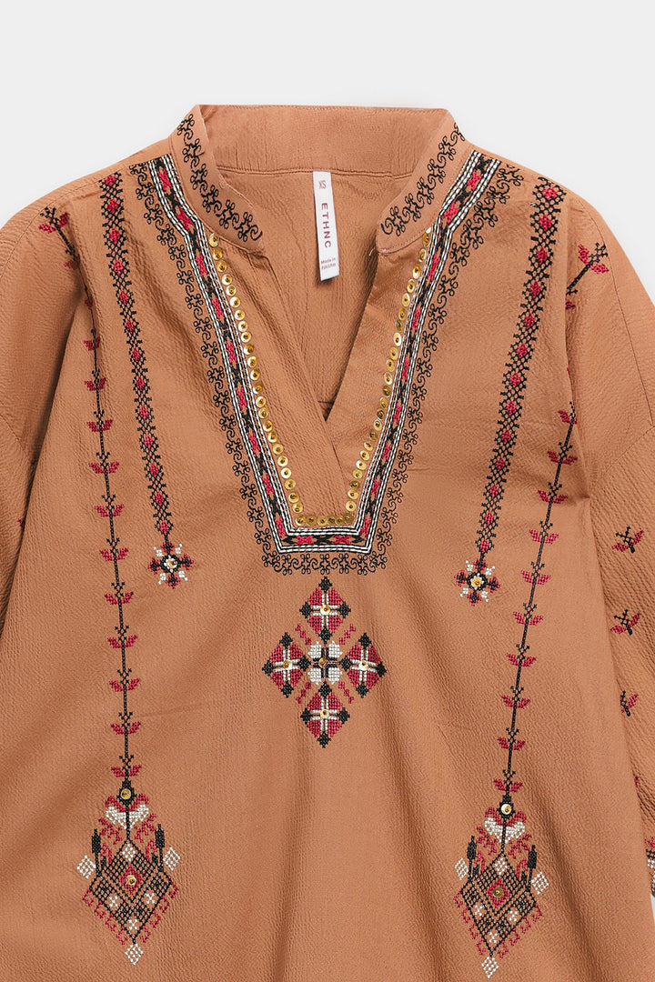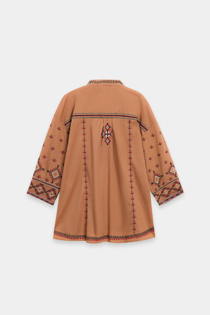 Capture rustic charm in this delightful tan embroidered kurti. This short-length, long-sleeved kurti is crafted from a comfortable, earthy tan fabric and features a casual V-neckline. It is intricately detailed with traditional multi-colored thread embroidery, primarily in blue, red, and gold, adorning the yoke, shoulders, and cuffs. The relaxed fit and detailed embellishment make this top a perfect choice for an elevated, comfortable daily or semi-formal look. Pair it with black tulip trousers or matching straight pants for a polished finish.