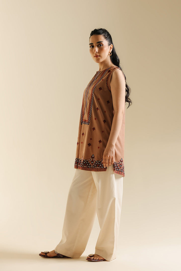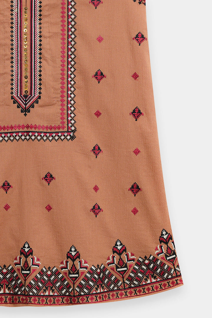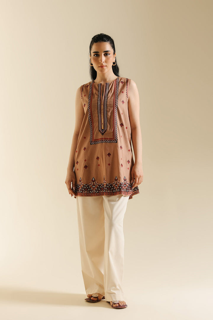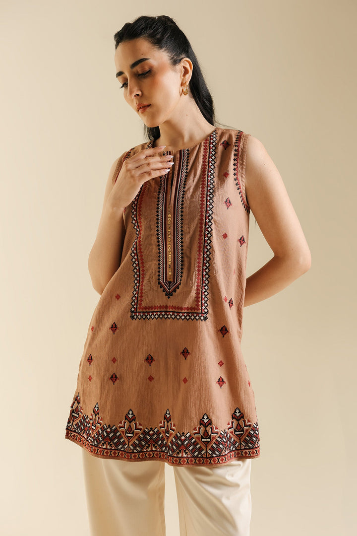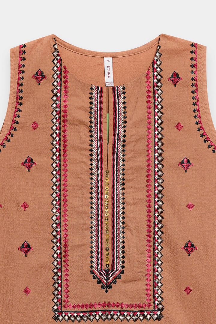 Capture rustic charm in this delightful tan embroidered kurti. This short-length, sleeveless kurti is crafted from a comfortable, earthy tan fabric and features a casual slit-neckline. It is intricately detailed with traditional multi-colored thread embroidery, primarily in black, red, and white, adorning the front. The relaxed fit and detailed embellishment make this top a perfect choice for an elevated, comfortable daily or semi-formal look.