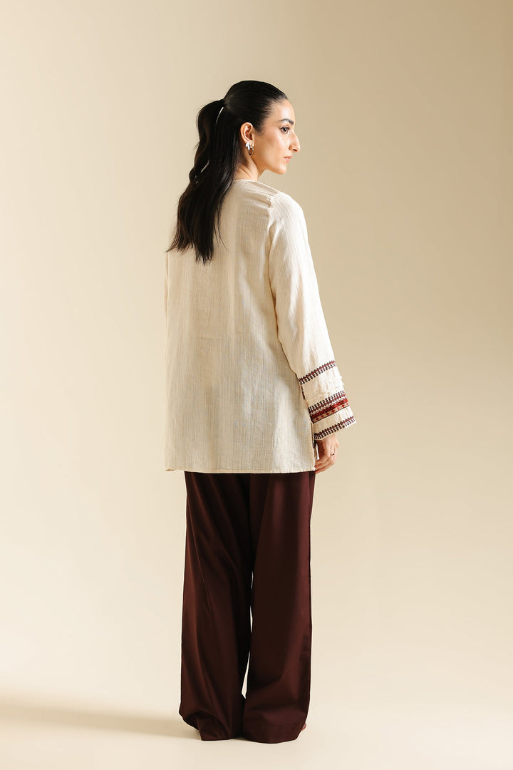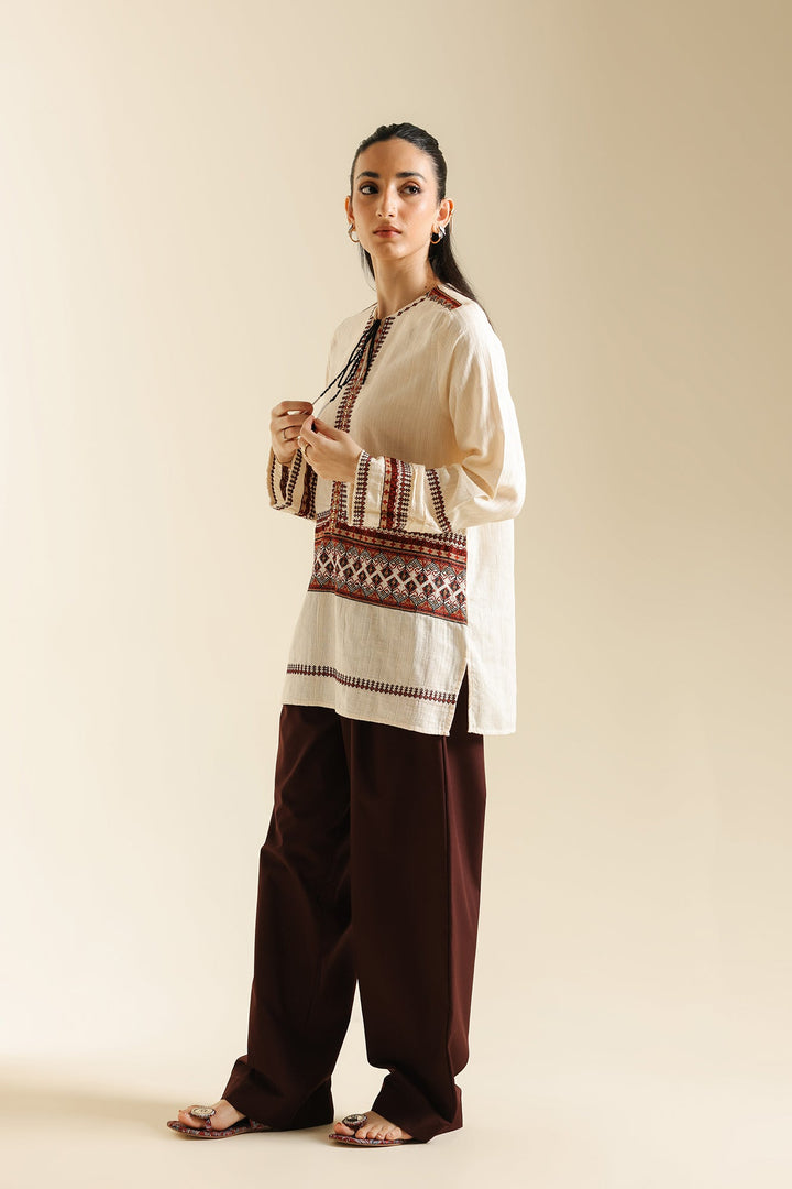 Inject an element of artisanal, bohemian flair into your look with this captivating cream kurti. This short, relaxed-fit kurti is crafted from a subtly textured, off-white fabric. It is striking due to its detailed embroidered banding in rich shades of maroon, deep orange, and black that adorns the yoke and cuffs of the long sleeves. The neckline features a charming drawstring and tassel detail. Shown paired with relaxed, dark-brown trousers, this kurti is a perfect piece for creating an effortlessly chic and grounded ensemble.