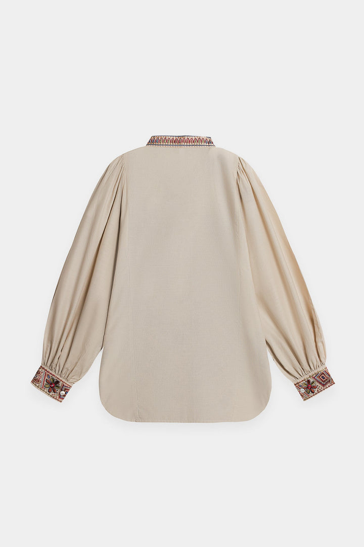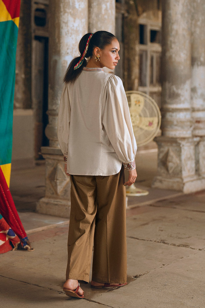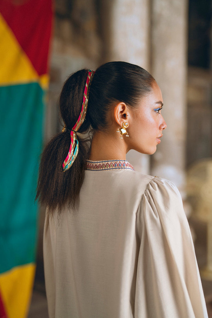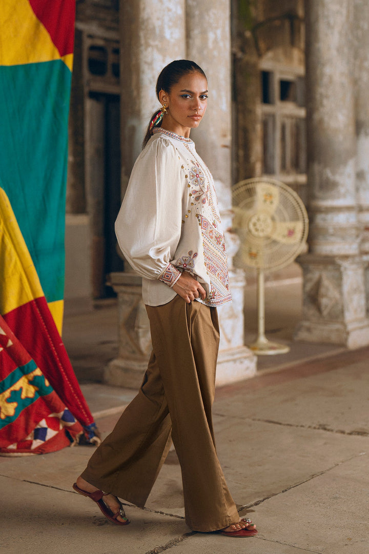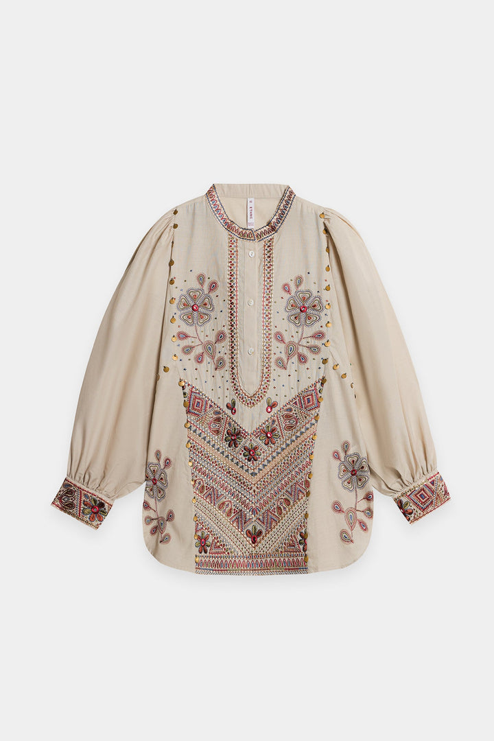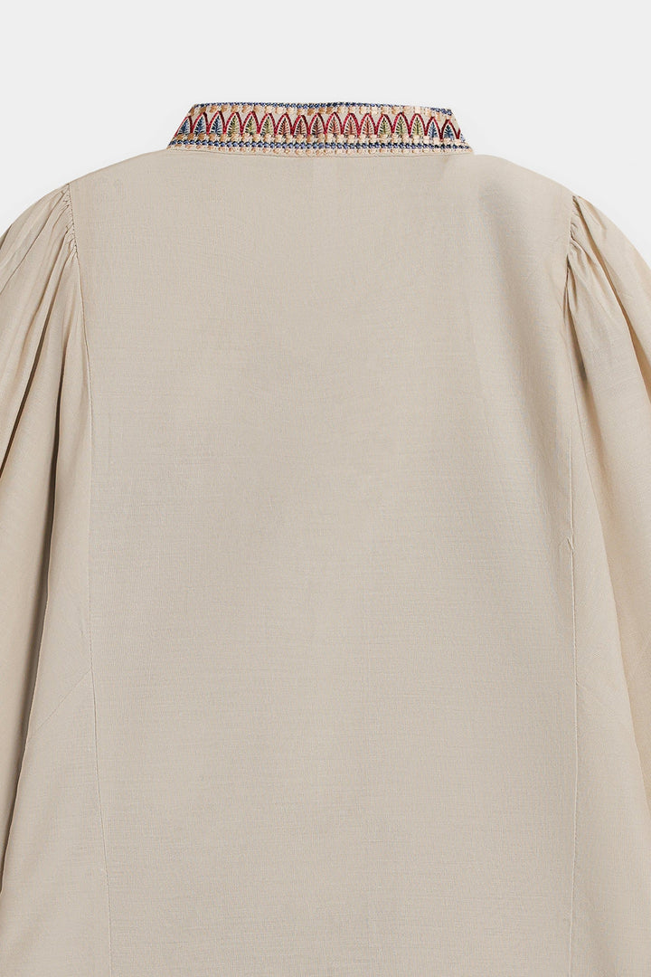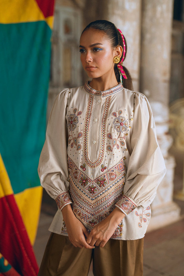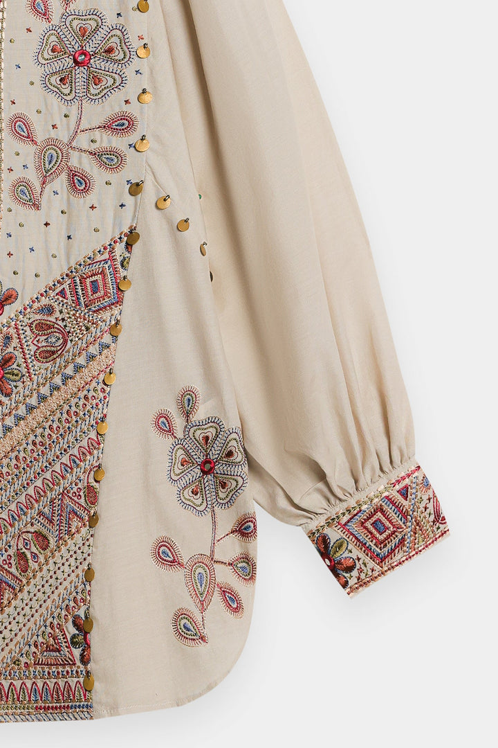 Adorn yourself in this elegant embroidered kurti! This beautiful top features a sophisticated geometric and floral pattern in shades of red, green , and grey on a light fabric. The high neckline and long, puffed sleeves with intricate cuff detailing add a touch of classic elegance. This kurti is a perfect choice for a festive occasion or a stylish day out.