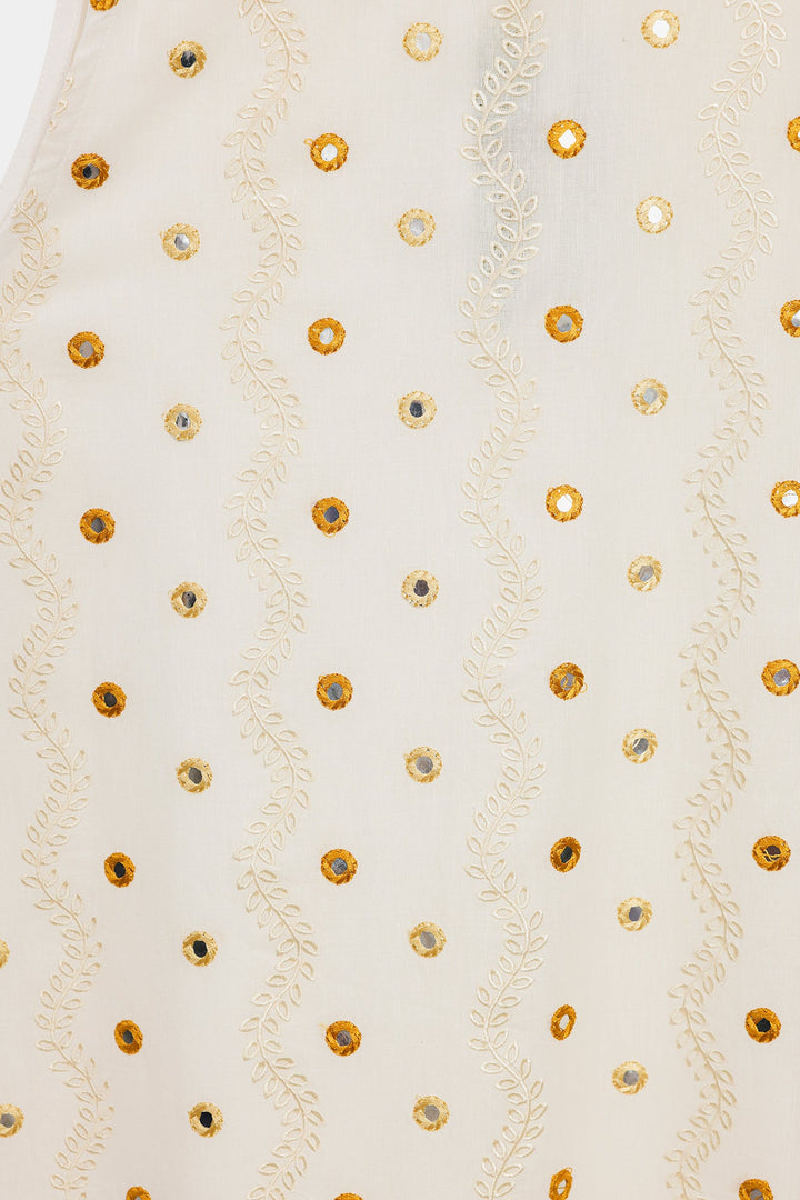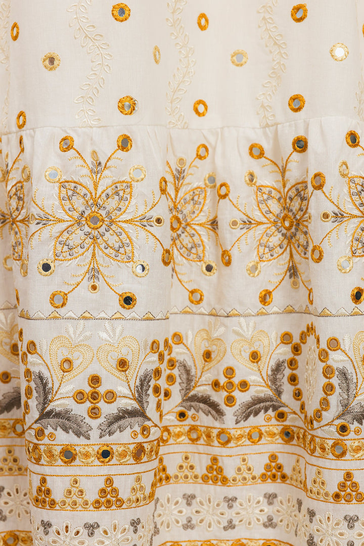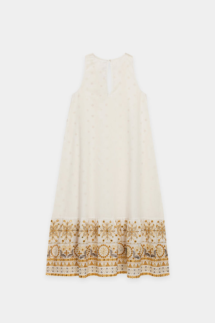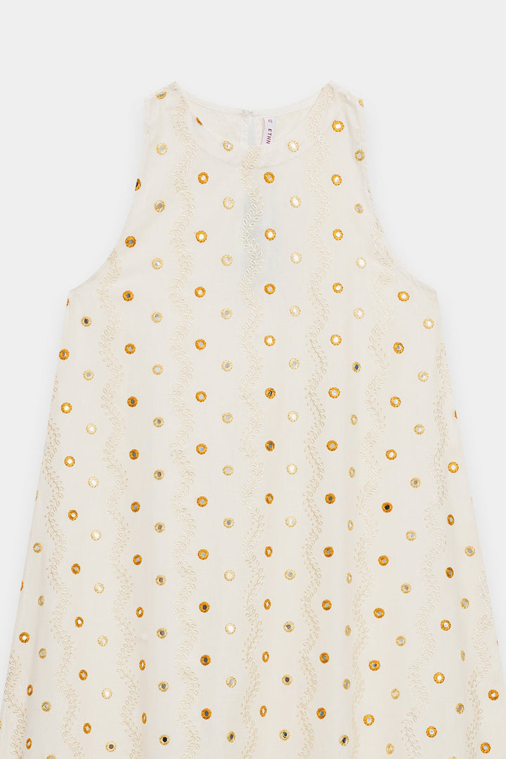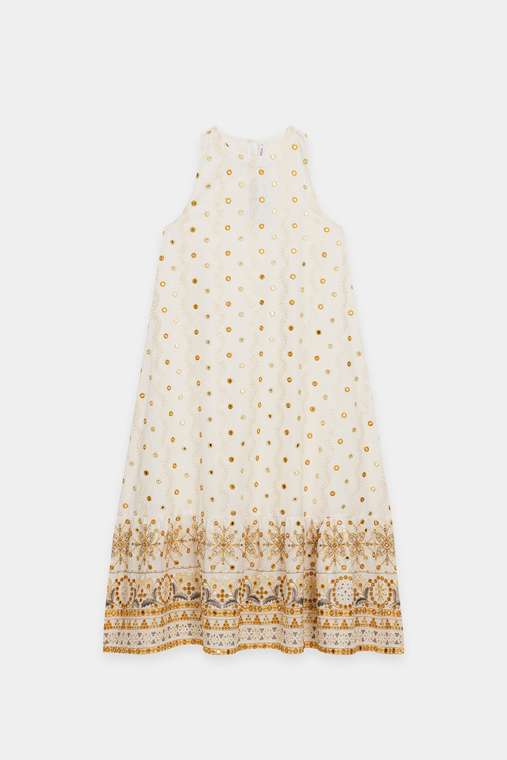 Radiate golden light in this ethereal white embroidered dress. This long, sleeveless dress is crafted from a pristine white fabric and features a delicate, subtle all-over gold mirror work detail. The skirt finishes with a gorgeous, intricate embroidered border in shades of gold and bronze, creating a lovely, flared effect. The round neckline and flowing silhouette make this a perfect piece for stylish, comfortable summer dressing.