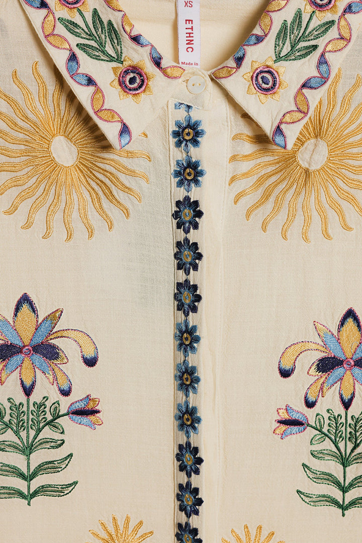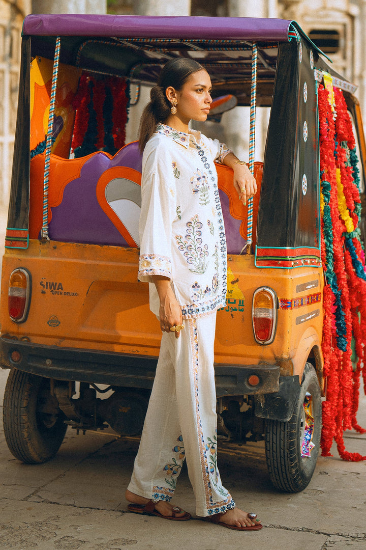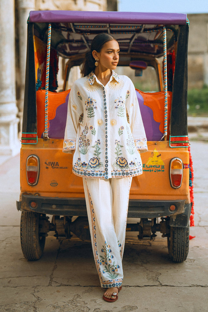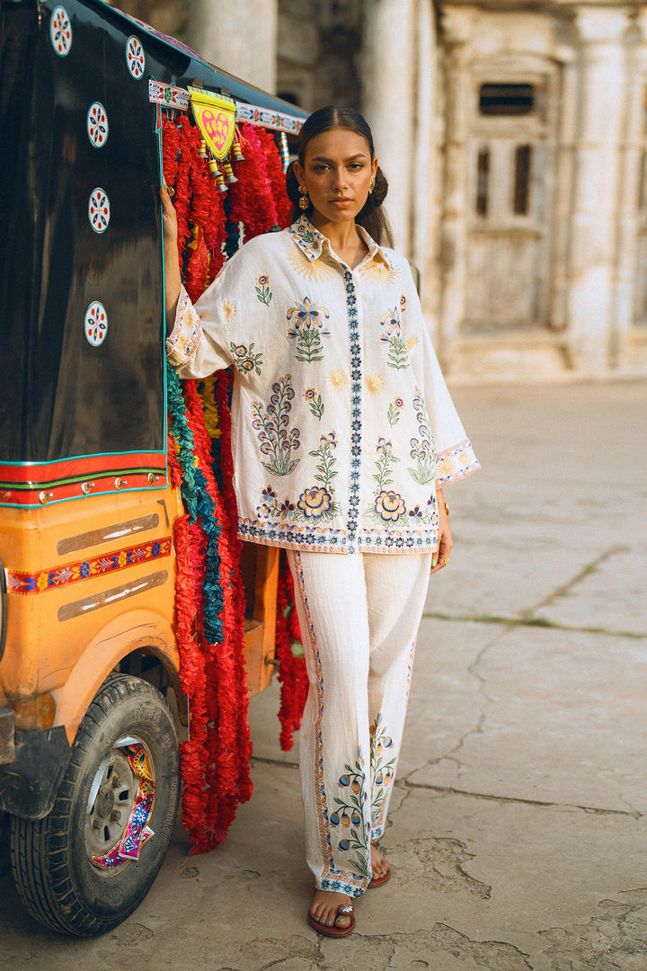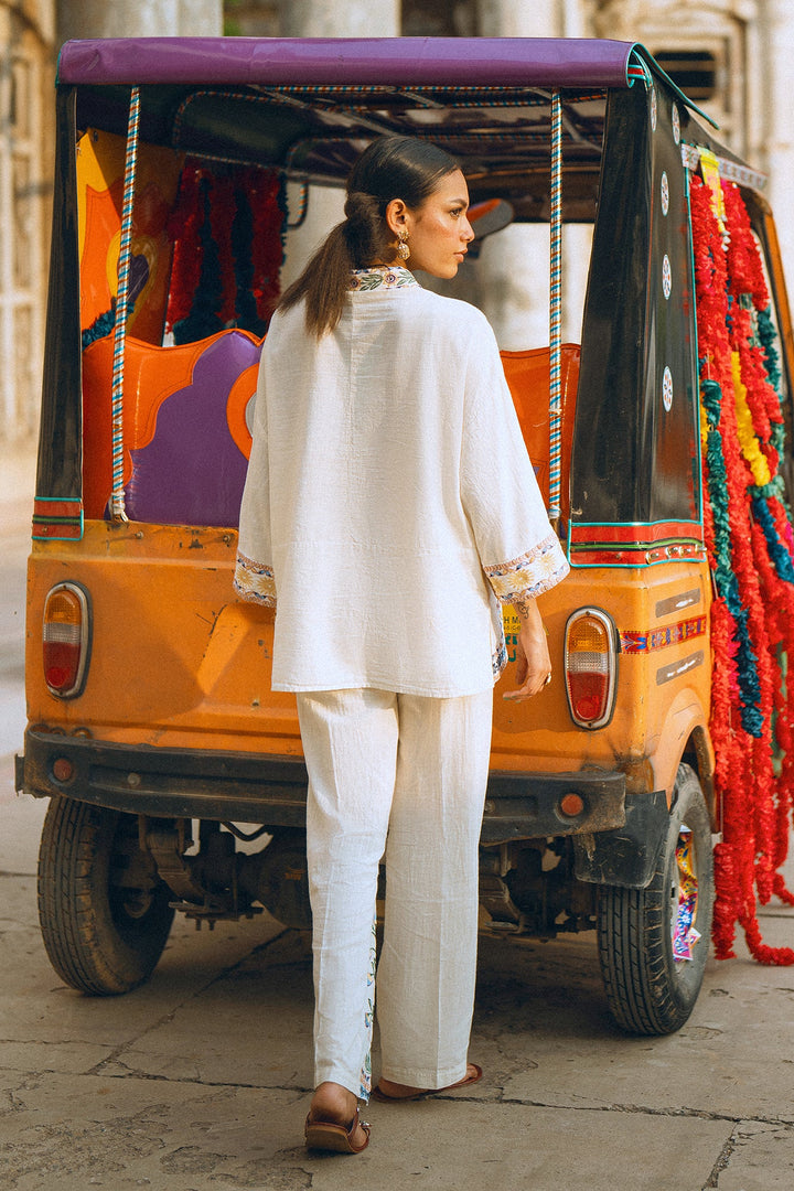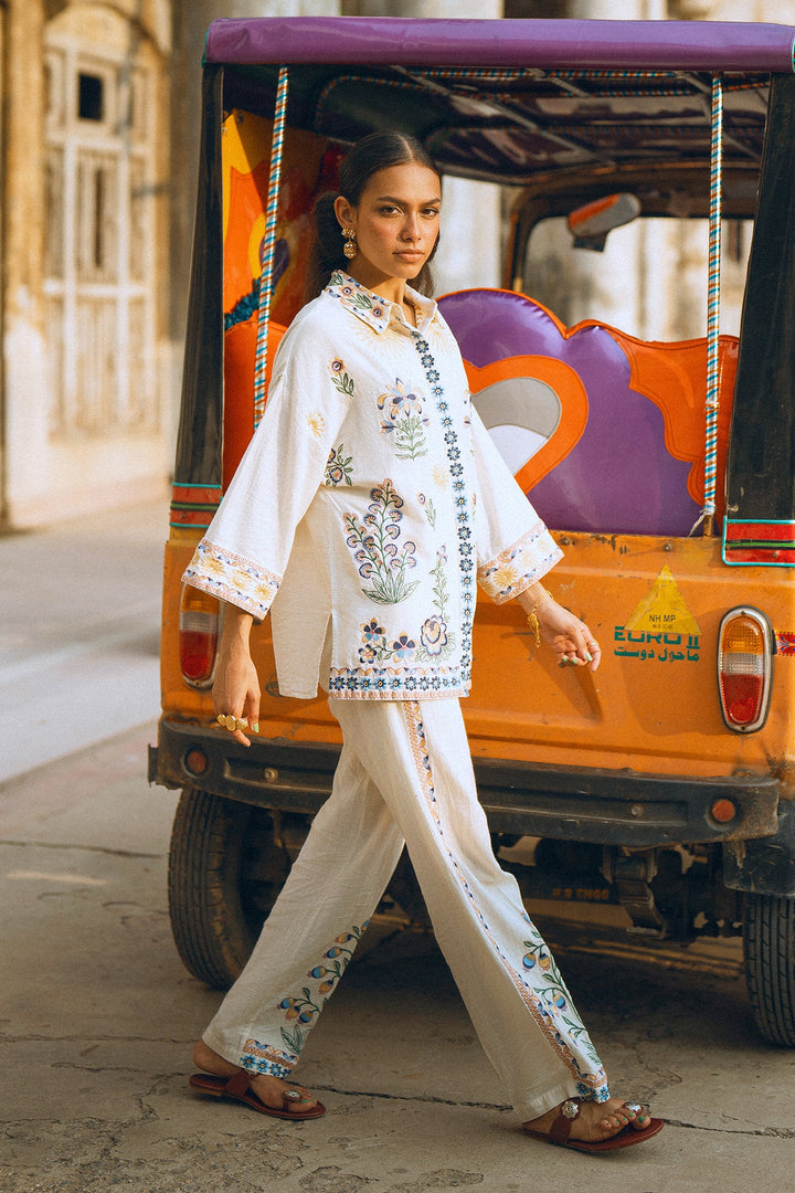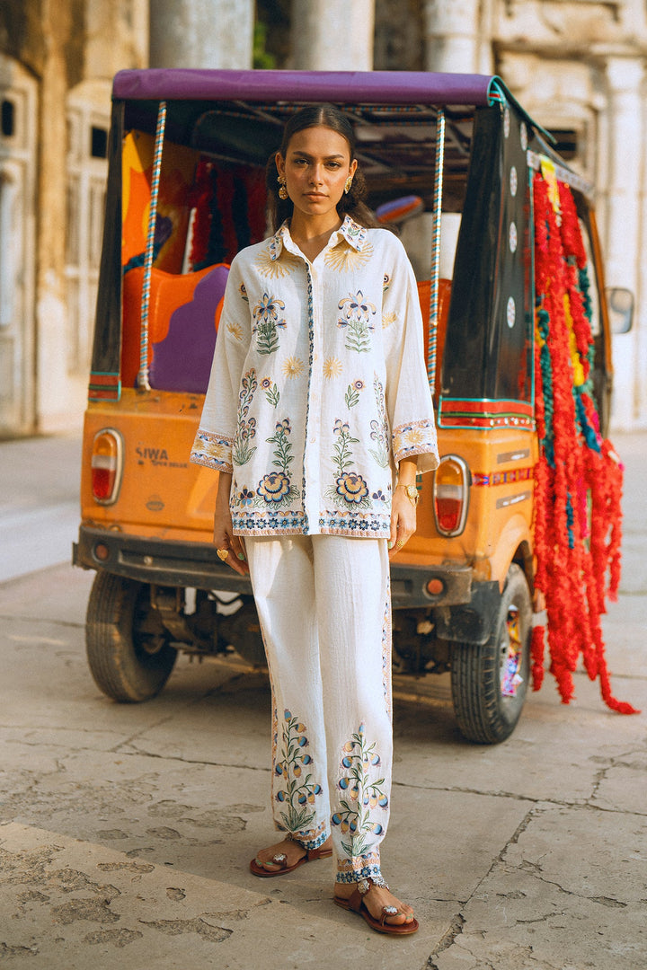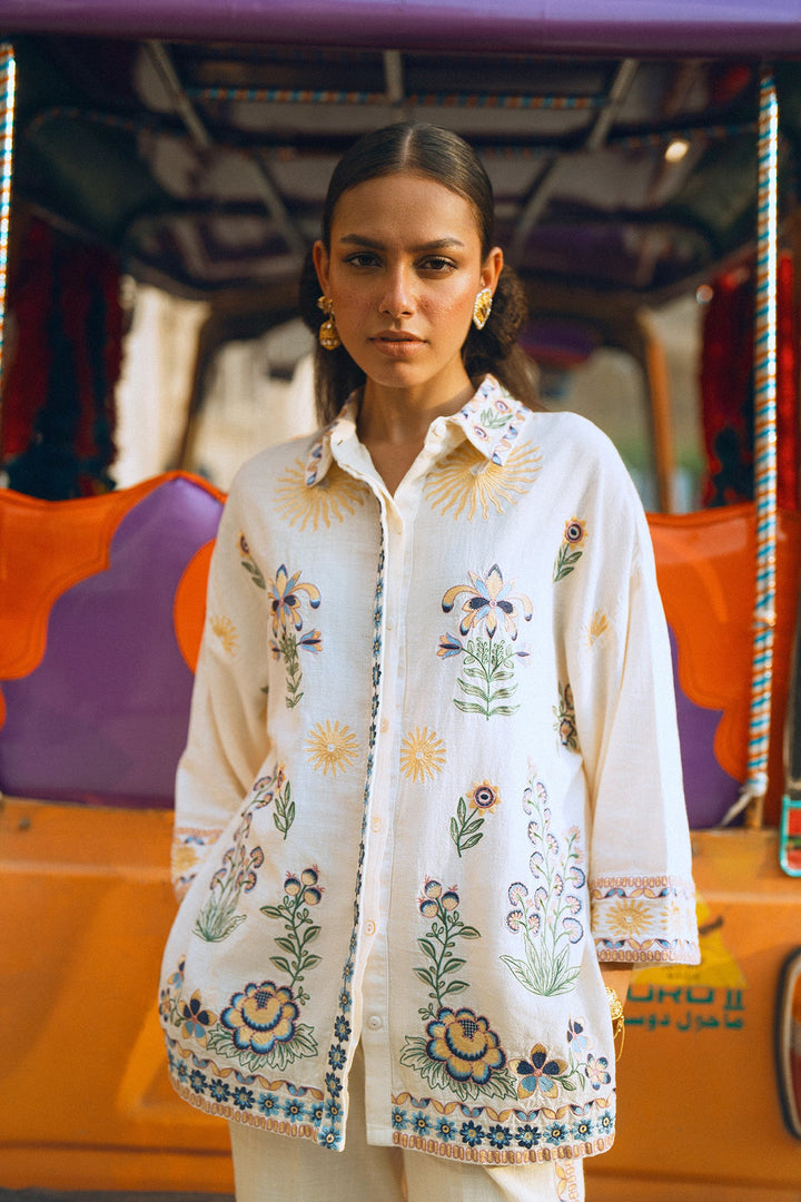 Make a graceful statement in this stunning embroidered suit! This two-piece set features a beautiful white button-down top adorned with intricate, multi-colored floral embroidery that adds a touch of artistic elegance. The full sleeves and relaxed fit make it perfect for all-day comfort. The suit is complemented by matching trousers with floral embroidery along the bottom, creating a cohesive and sophisticated look. This ensemble is ideal for any special occasion or a festive gathering where you want to look effortlessly chic.