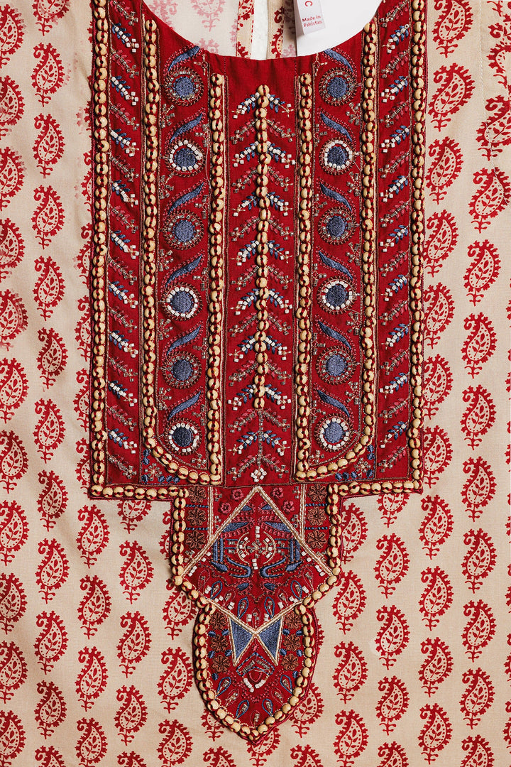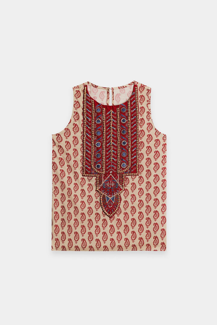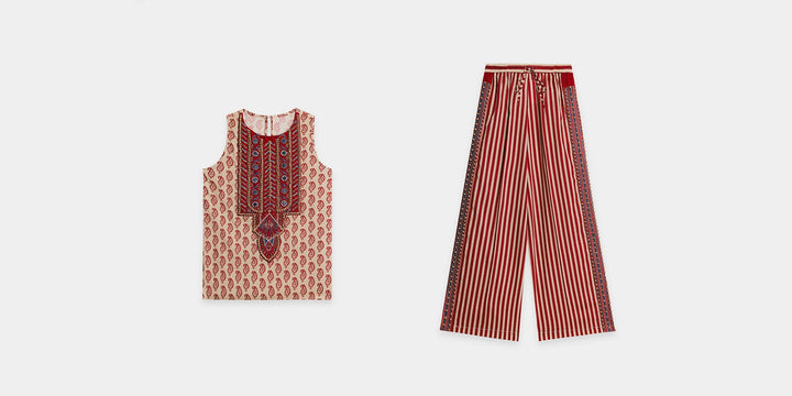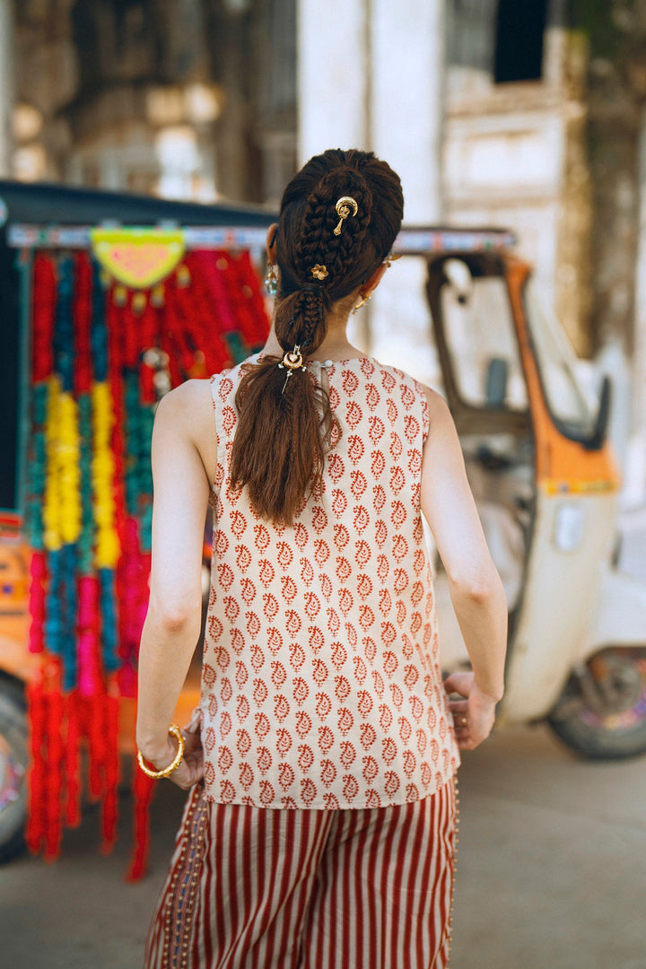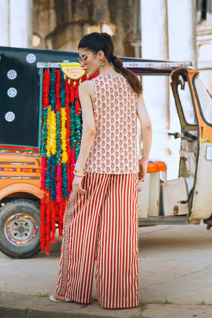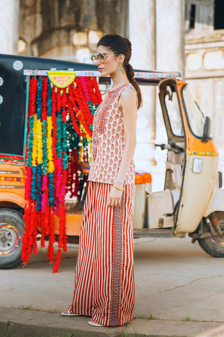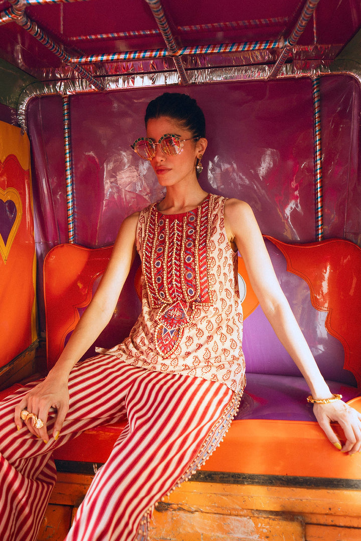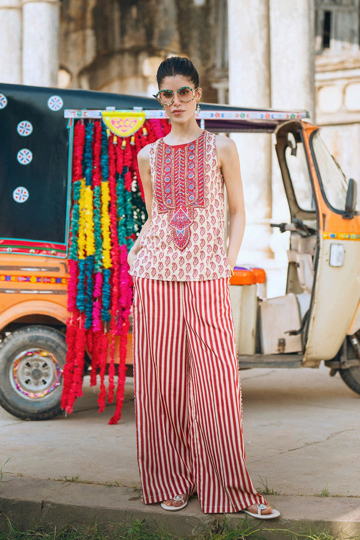 Make a vibrant statement with this beautiful red and white co-ord set. The sleeveless top features an intricate, colorful embroidery and embellishments on the front, creating a striking and artistic pattern. The set is completed with matching striped trousers, designed for a comfortable and fashionable fit. This unique and stylish ensemble is perfect for a special occasion or a festive gathering.