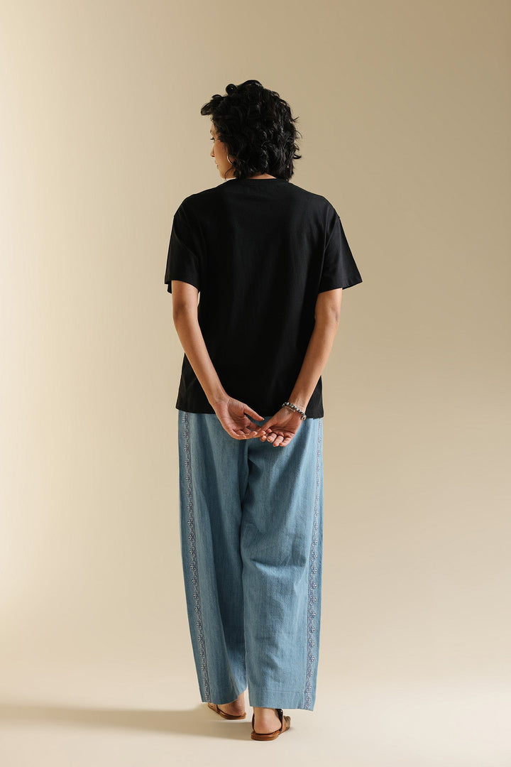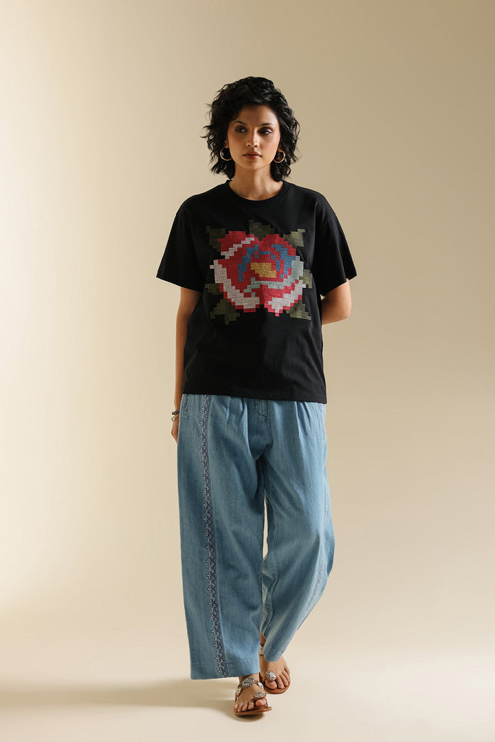Make a bold artistic statement with this unique black t-shirt, where classic comfort meets captivating design. The relaxed-fit tee features a striking, multi-colored floral motif rendered in a pixelated embroidery style, creating a modern and eye-catching focal point. The vibrant hues of red, blue, green, and white burst against the deep black fabric, making it perfect for adding an artistic edge to your casual wear, or dressing up for a distinctive look.
