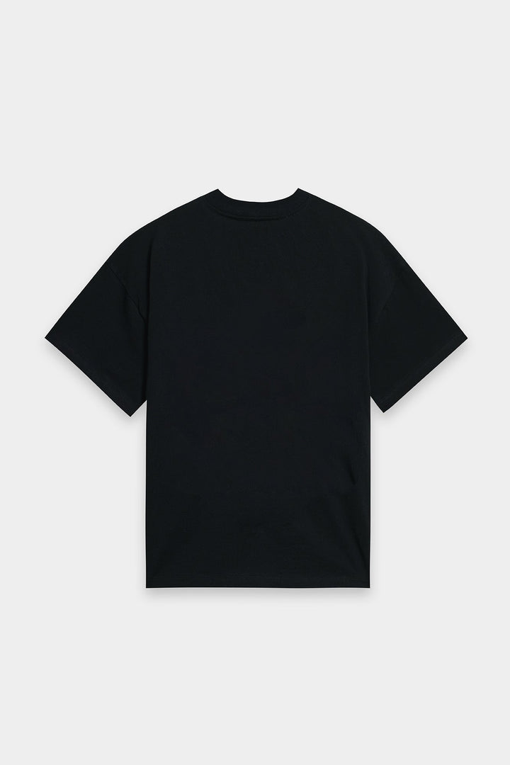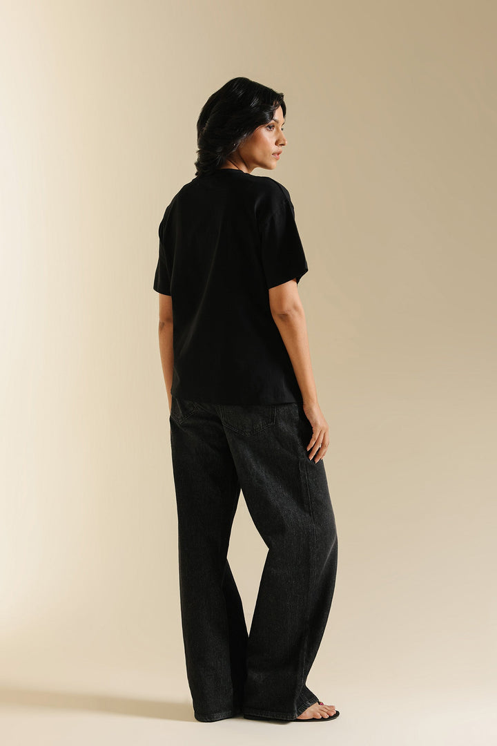 Make a bold artistic statement with this unique black t-shirt, where classic comfort meets captivating design. The relaxed-fit tee features a striking, multi-colored floral motif rendered in a pixelated embroidery style, creating a modern and eye-catching focal point. The vibrant hues of red, blue, green, and yellow burst against the deep black fabric, making it perfect for adding an artistic edge to your casual wear, or dressing up for a distinctive look.